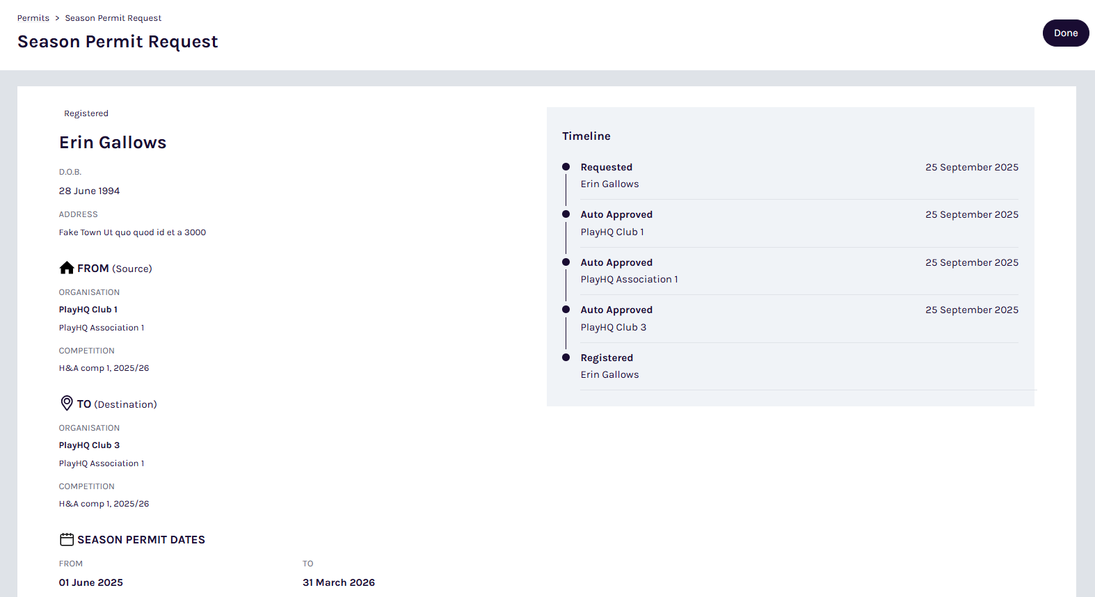 Season Permits can be initiated by a player when registering to a secondary club in a competition season, if this option is made available by the Association in the Competition settings.