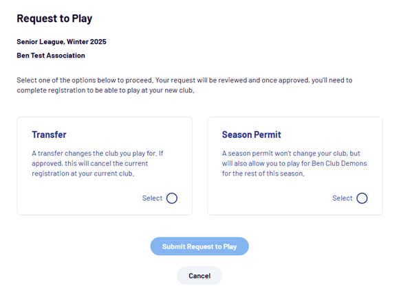 If the participant wishes to play for an additional club without changing their home club, they should select Season Permit and then select Submit Request to Play.