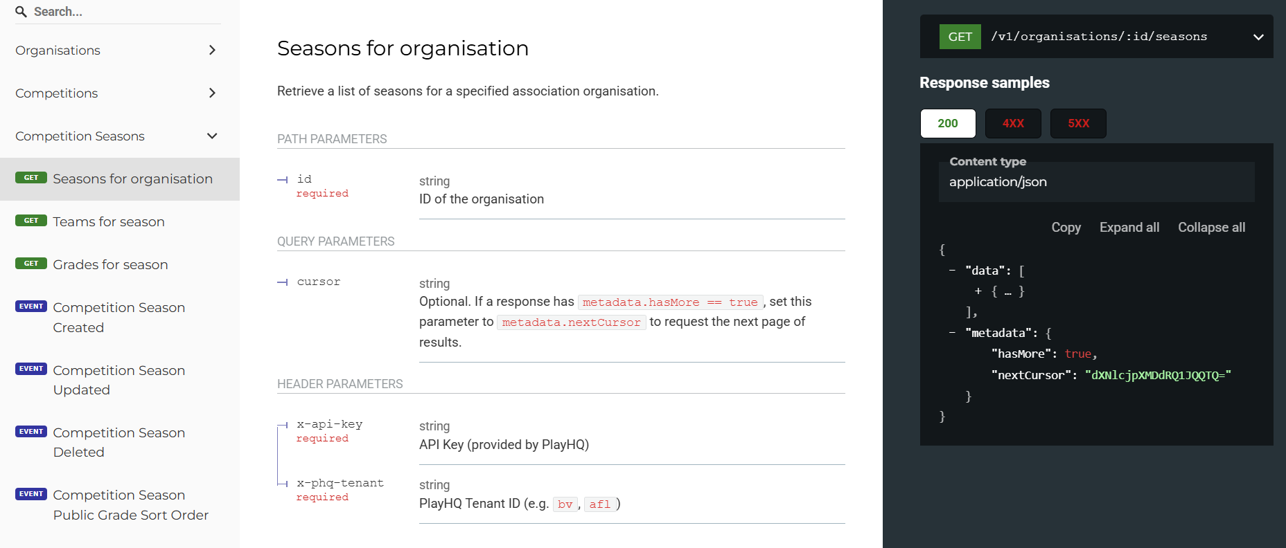 - Copy the API server URL (e.g. https://api.playhq.com/v1/organisations/:id/seasons)