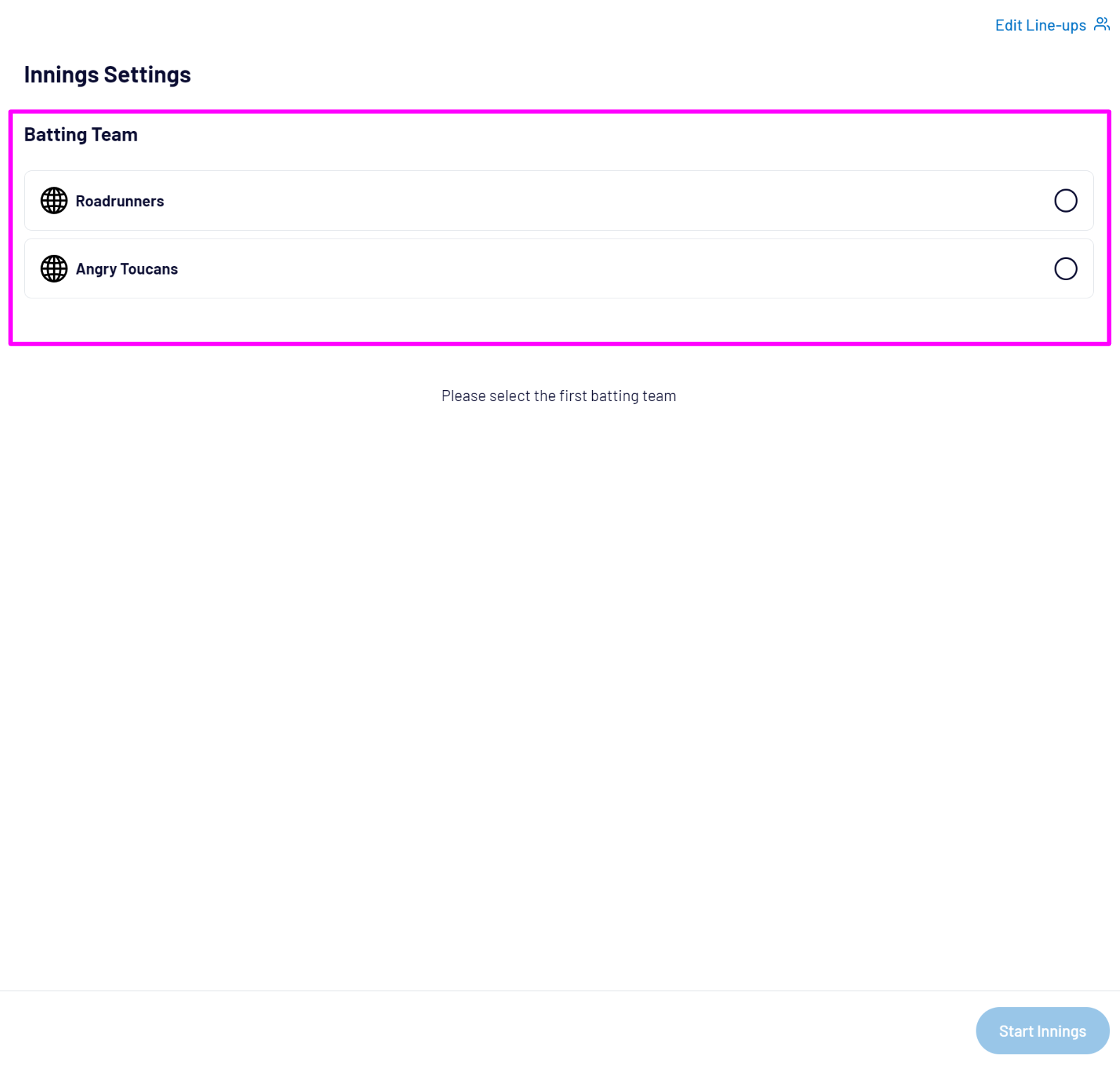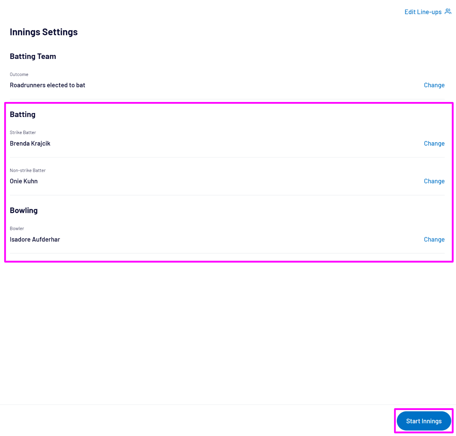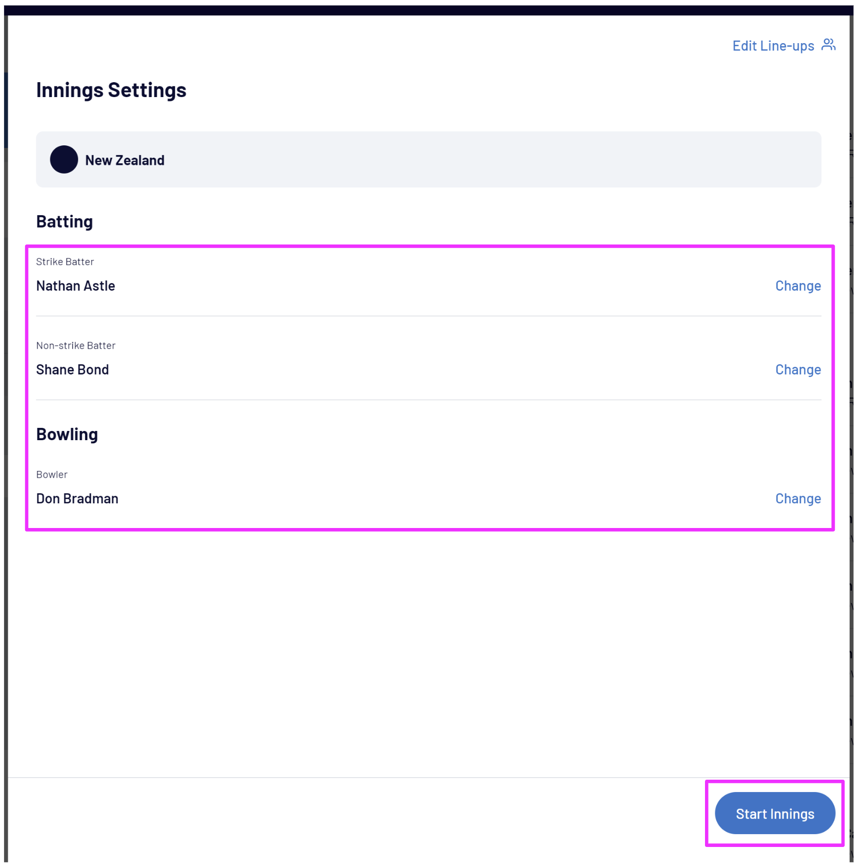 To commence the next innings, select the new Strike batter, Non-strike Batter and Bowler then Start Innings: