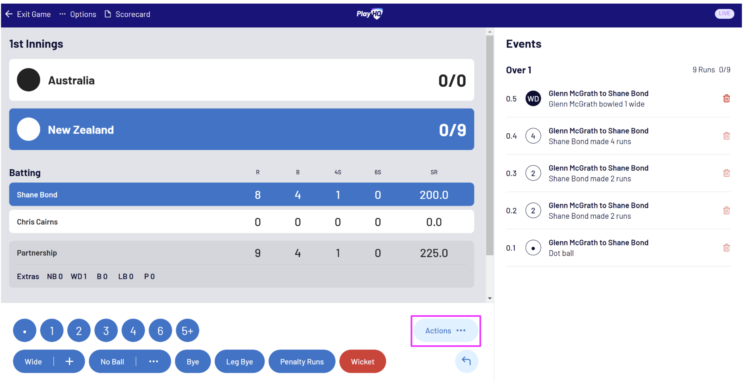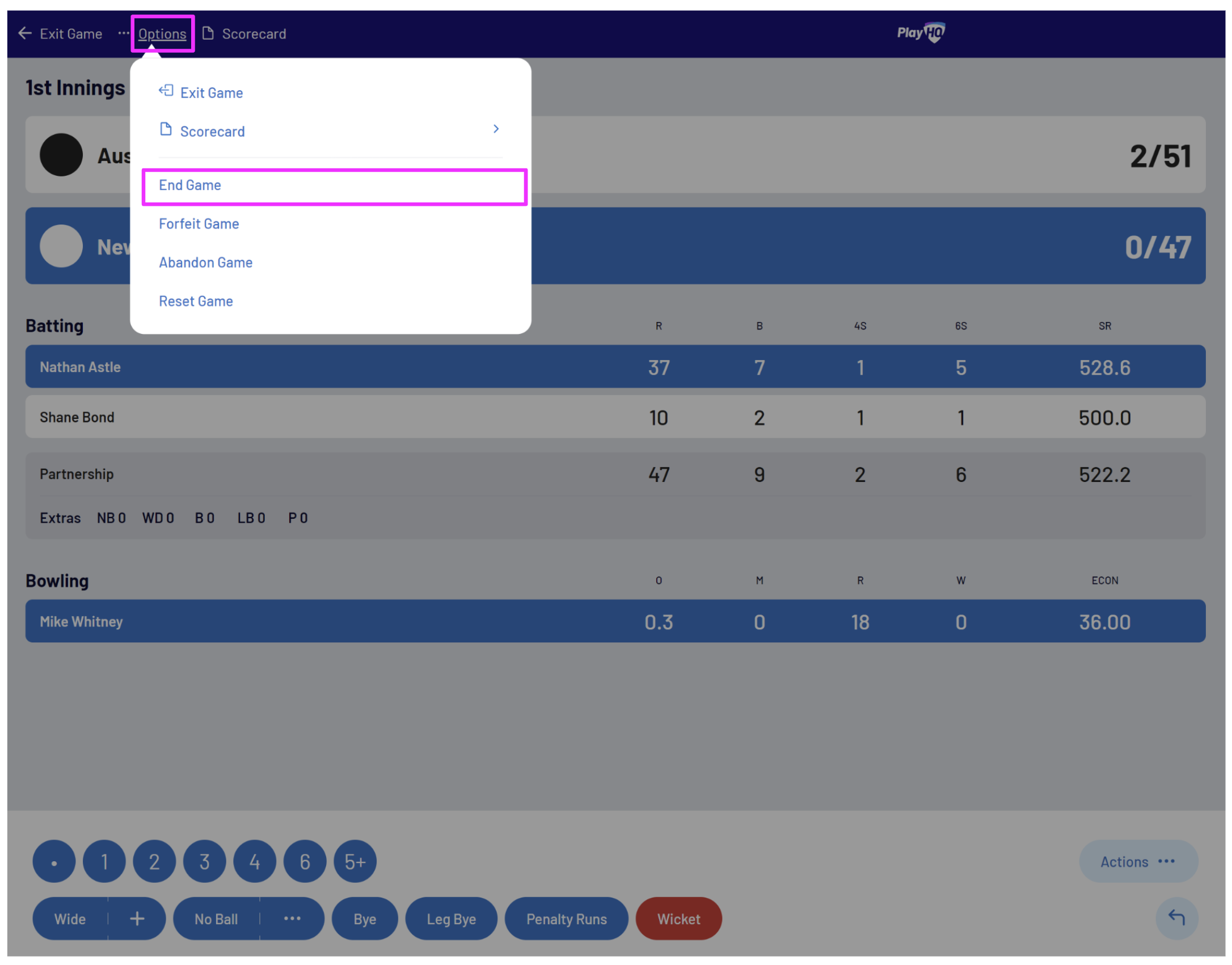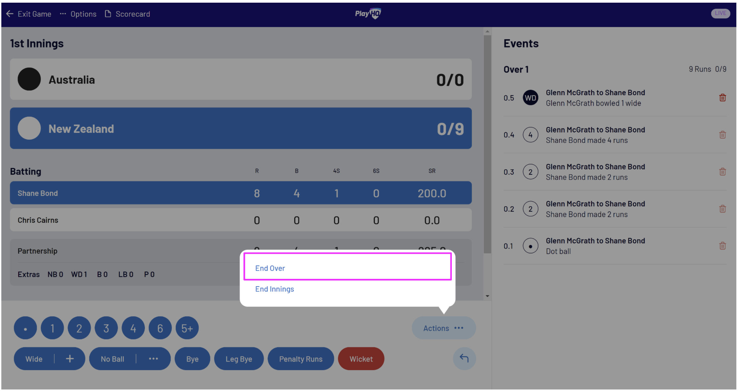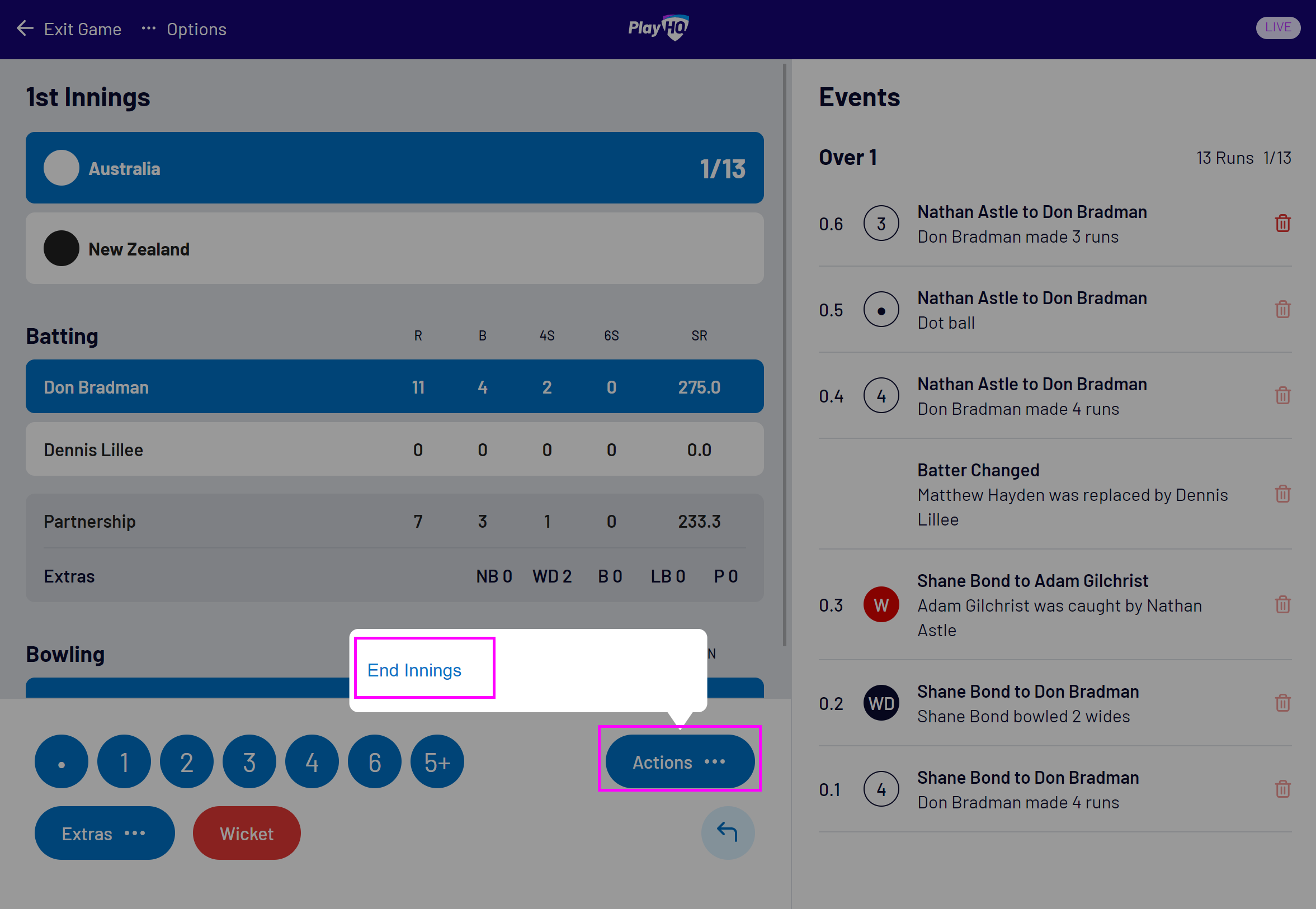 To end an innings manually, select Actions then End Innings: