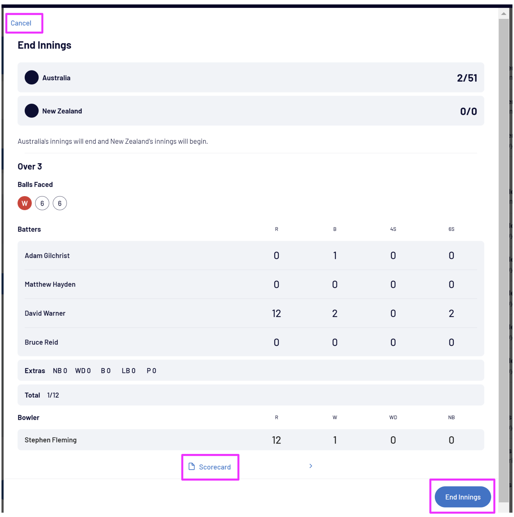 An End Innings modal will pop up which displays the current team scores and a summary of all the events that occurred within that over.