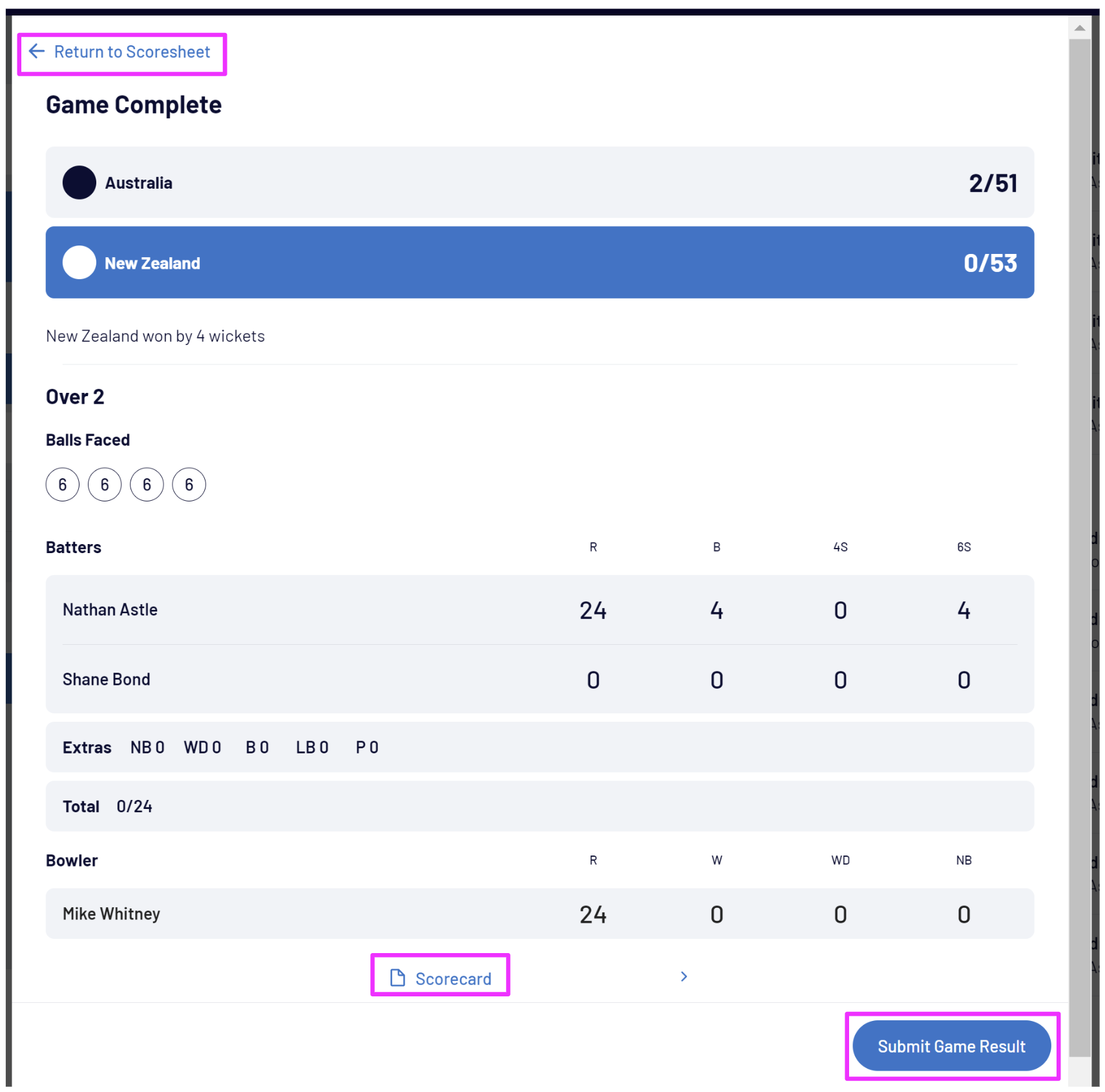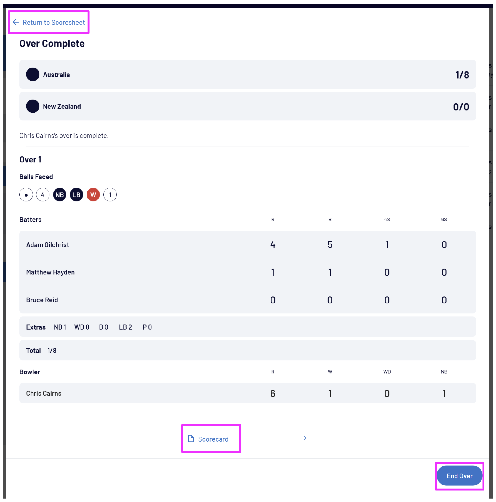At the end of the over, you can either select Return to Scoresheet to make updates to the over, Scorecard to view or adjust the team scores or batter statistics, or select End Over to commence the next over: