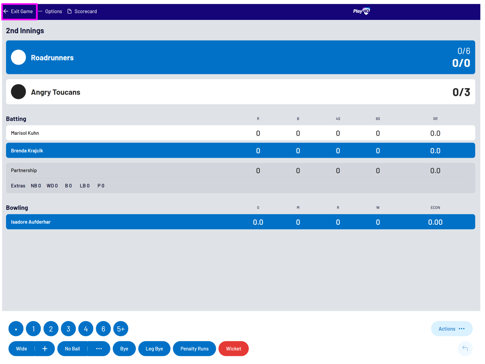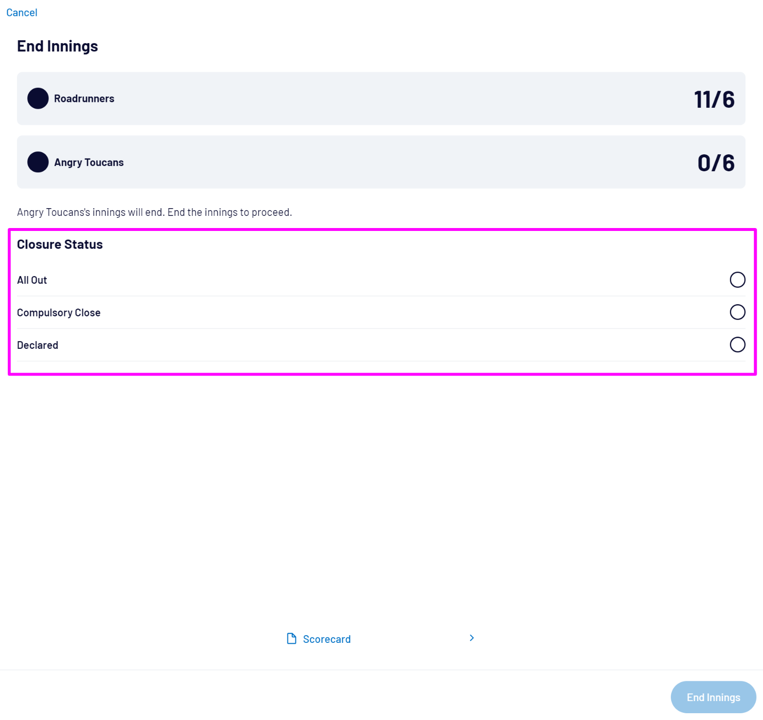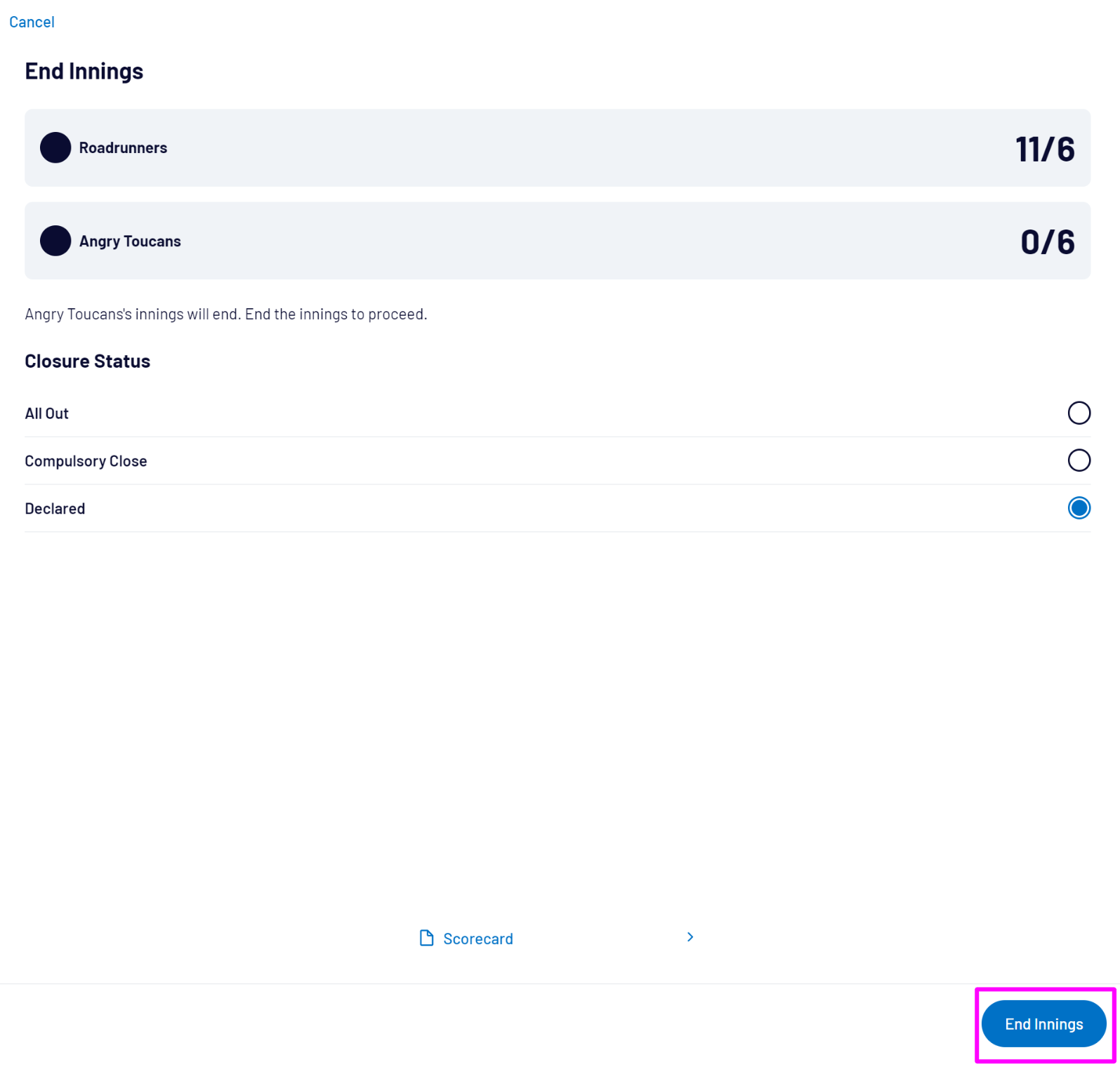 You can either select Cancel to return to the scoresheet, select Scorecard to view or adjust scorecard, or select End Innings to start the next team’s innings: