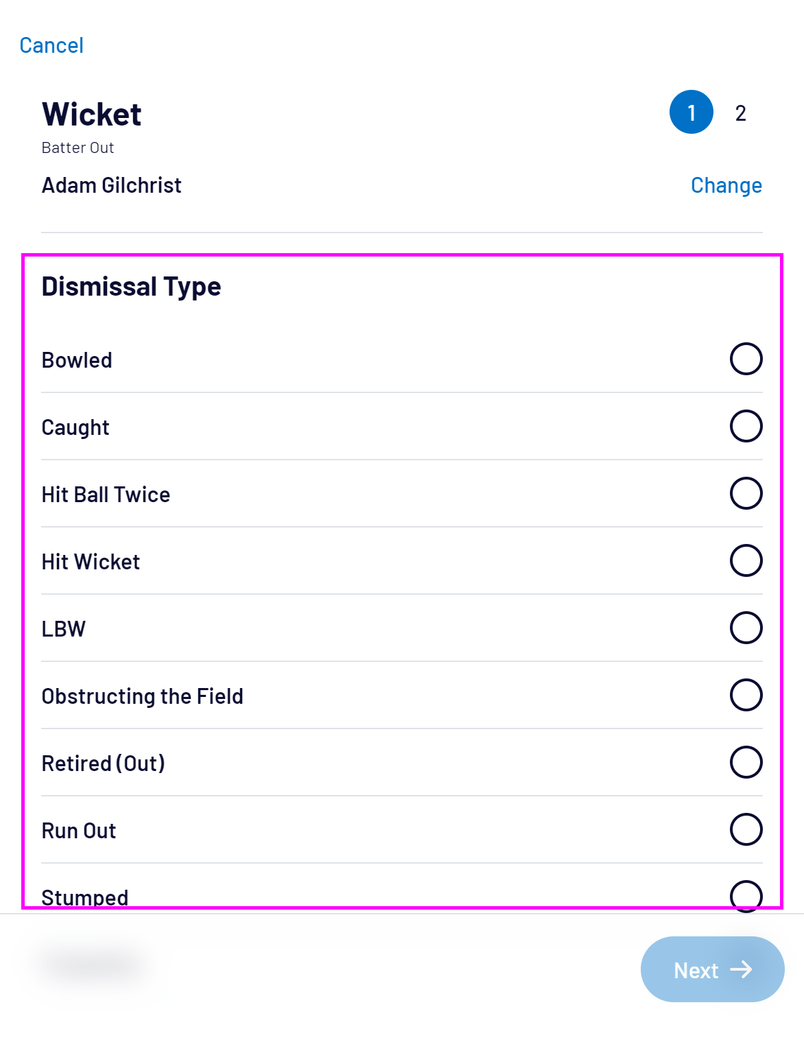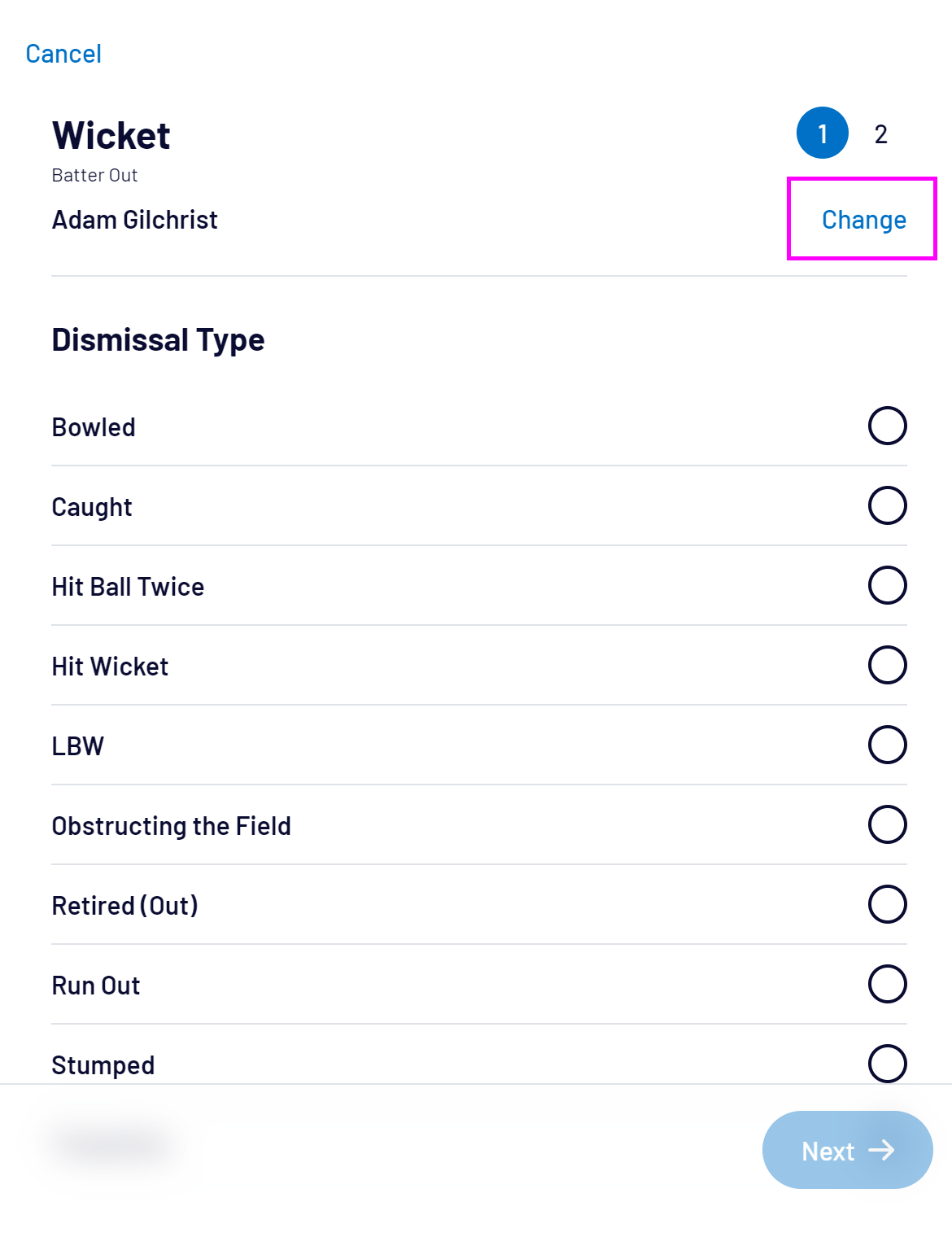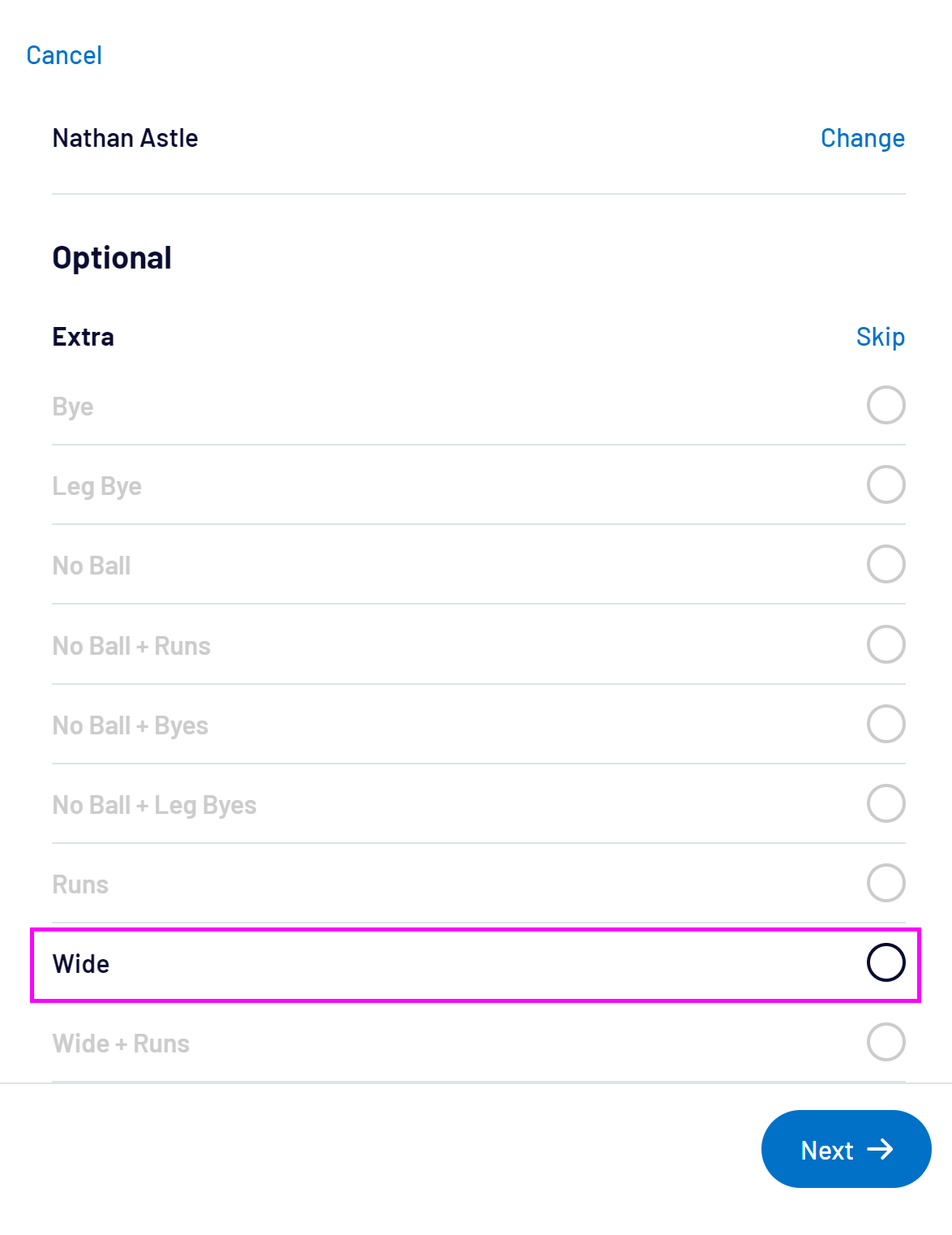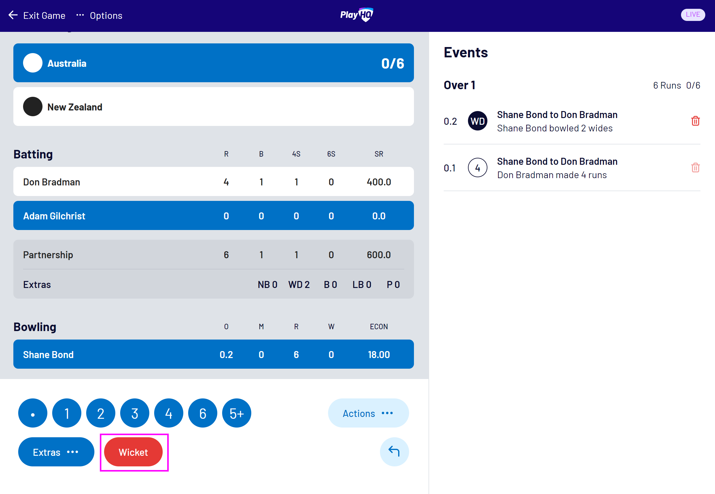 To record a wicket, select the Wicket button: