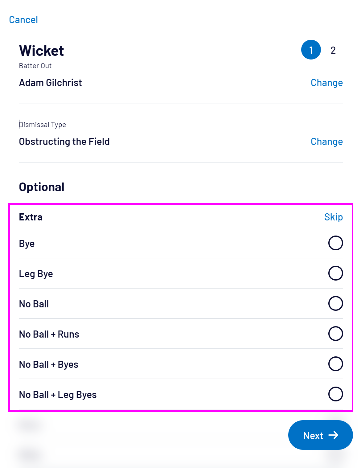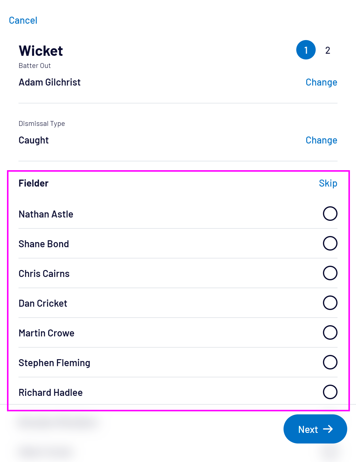 For Caught, Run-out or Stumped dismissals, you can also select the Fielder or select Skip: