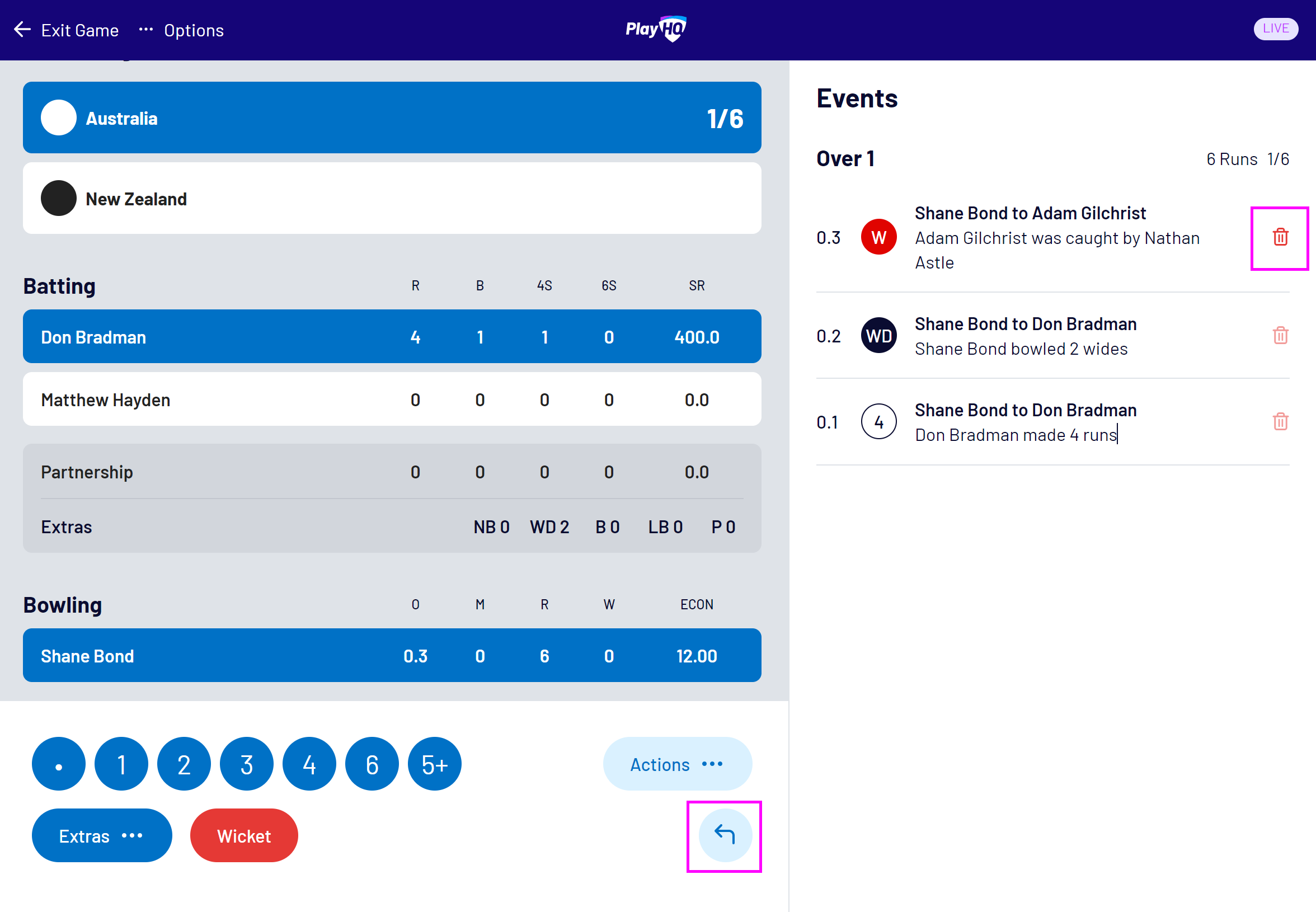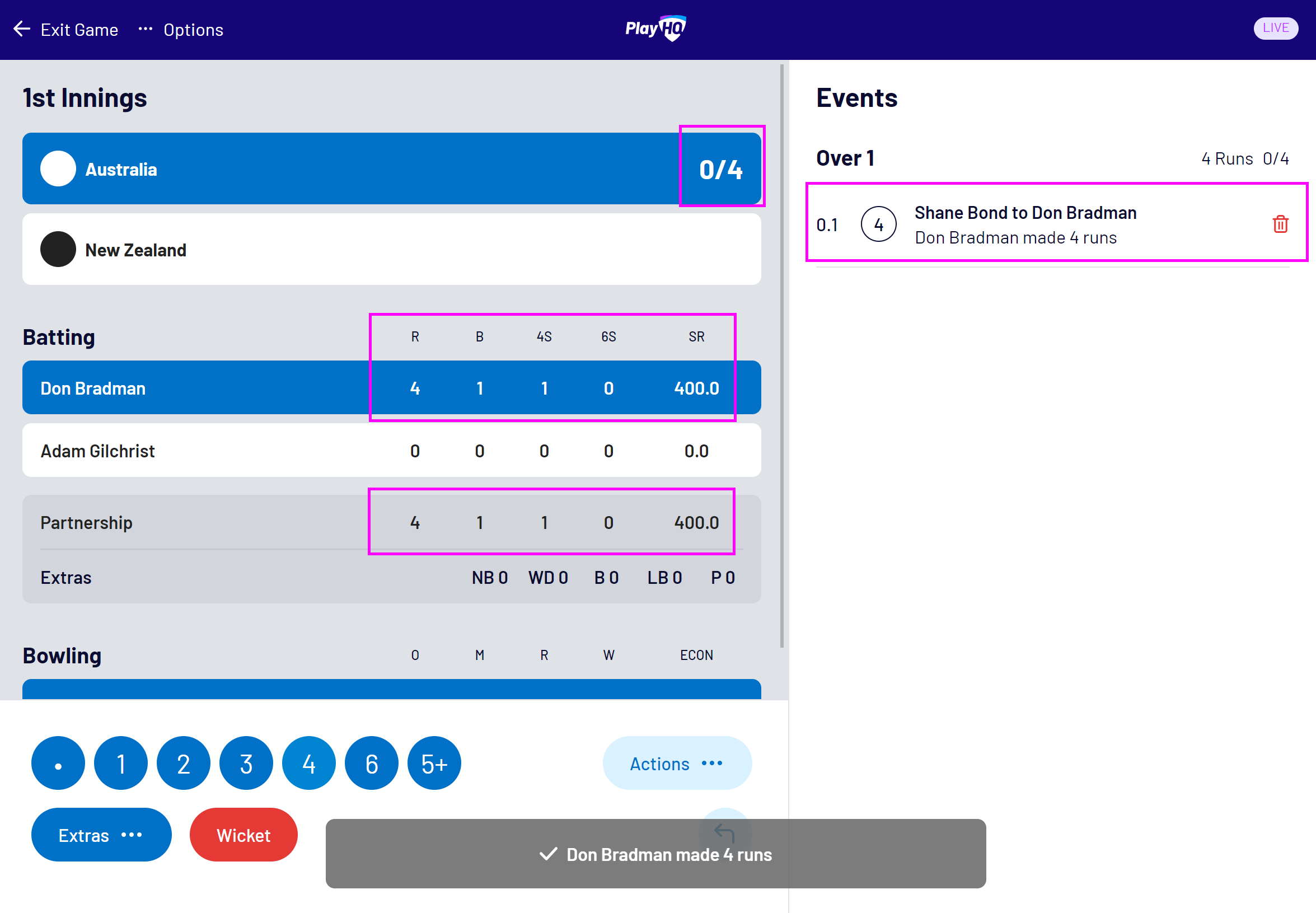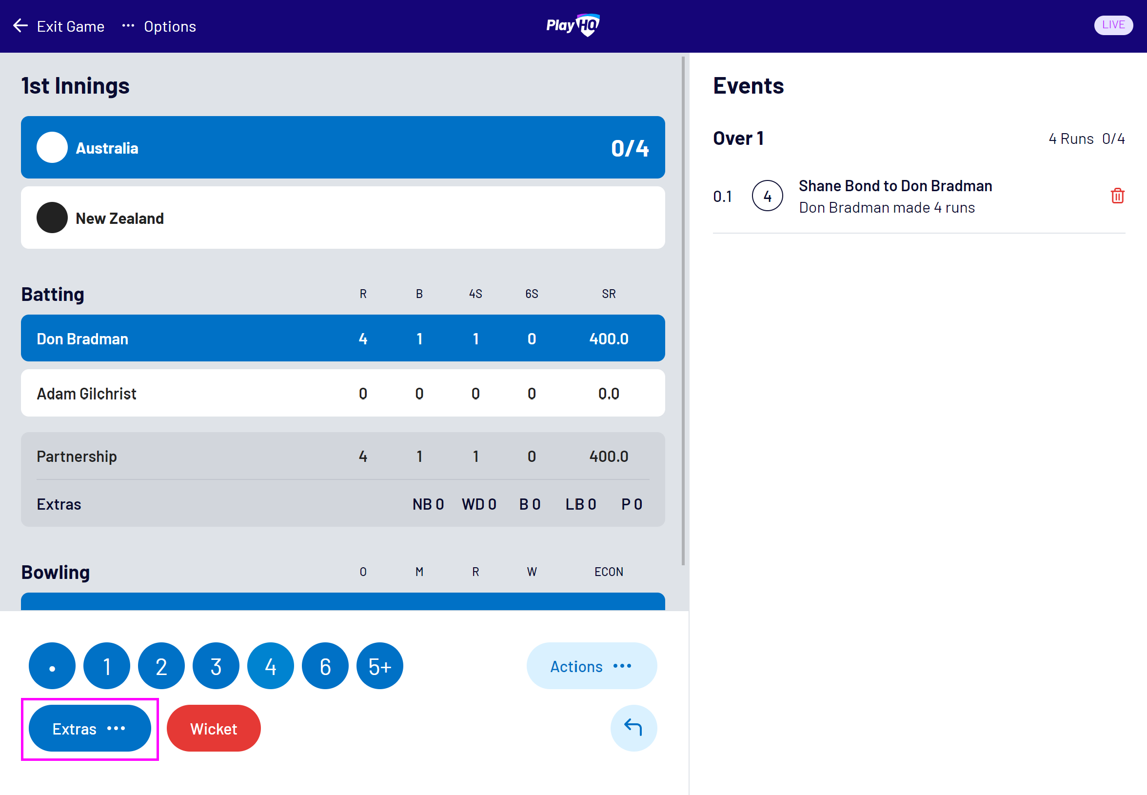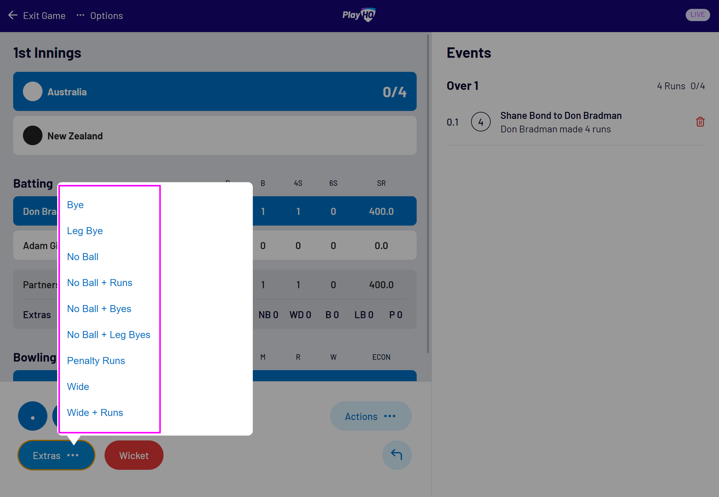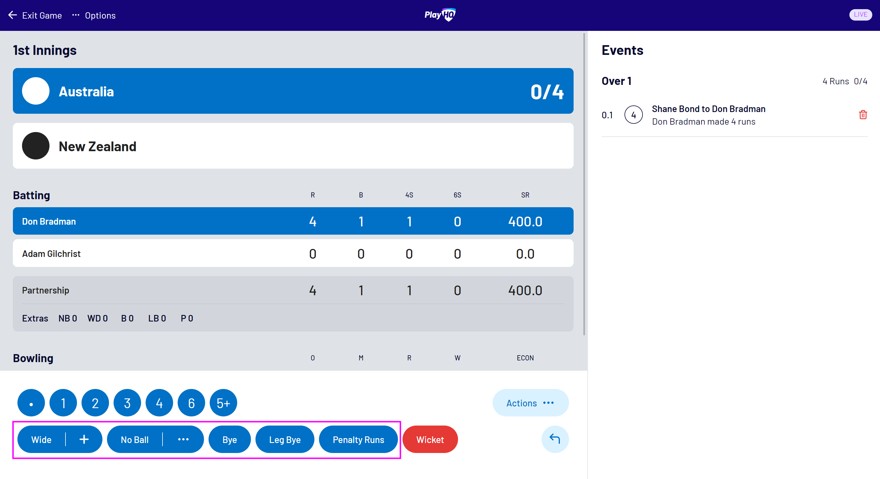 This article describes how to record runs, wickets, extras and combinations of these events in the PlayHQ Cricket electronic scoring application.
