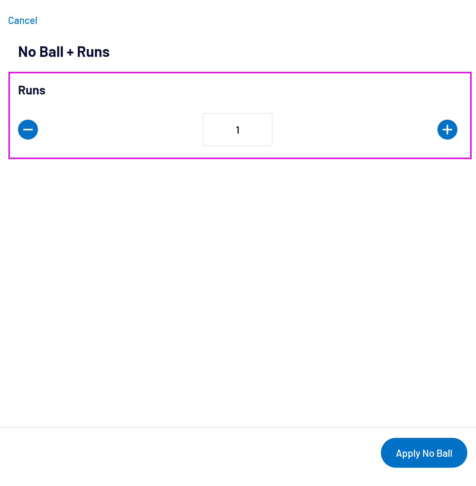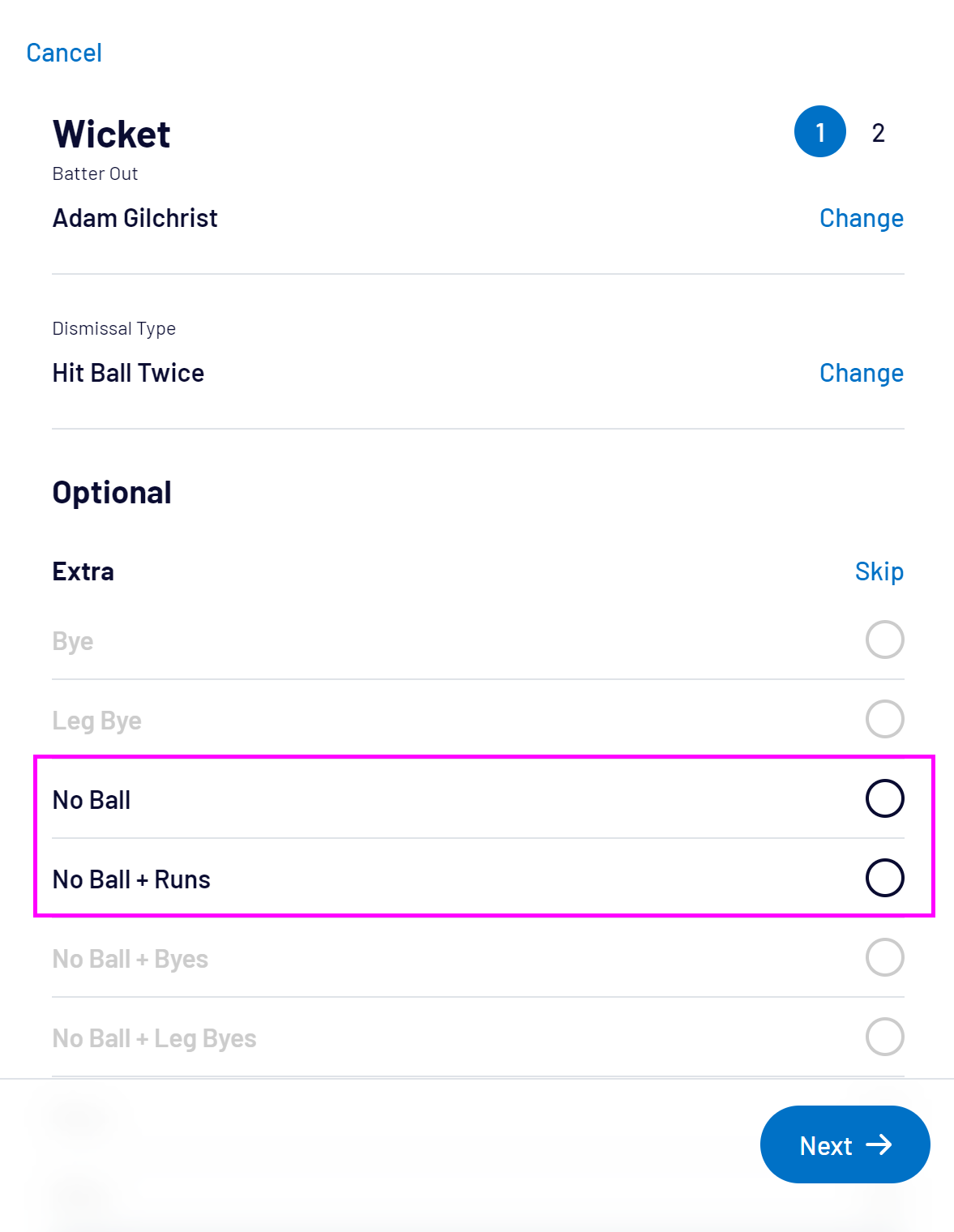 When selecting No Ball + Runs, No Ball + Byes or No Ball + Leg Byes, enter the runs that were made by the batters only. Any bonus runs awarded for the no ball, configured for your grade by your Association Administrator, will automatically be added to the batting team’s score.