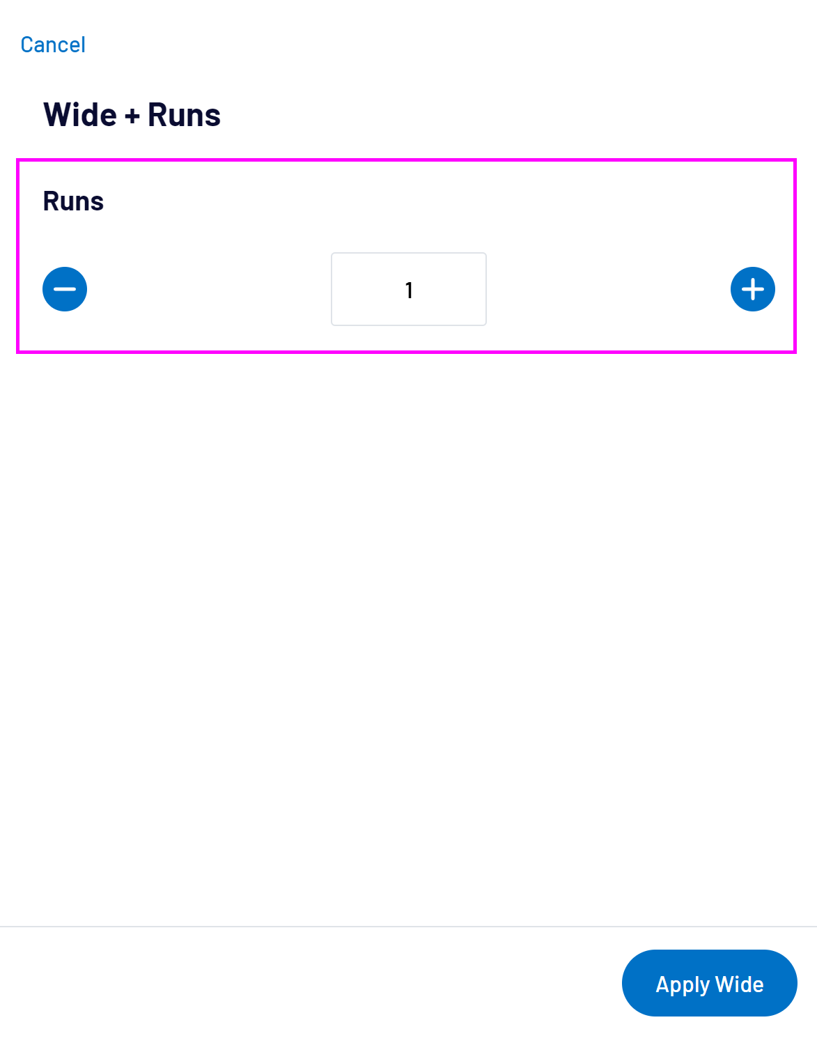 When selecting Wide + Runs, enter the runs that were made by the batters only. Any bonus runs awarded for the wide, configured for your grade by your Association Administrator, will automatically be added to the batting team’s score.