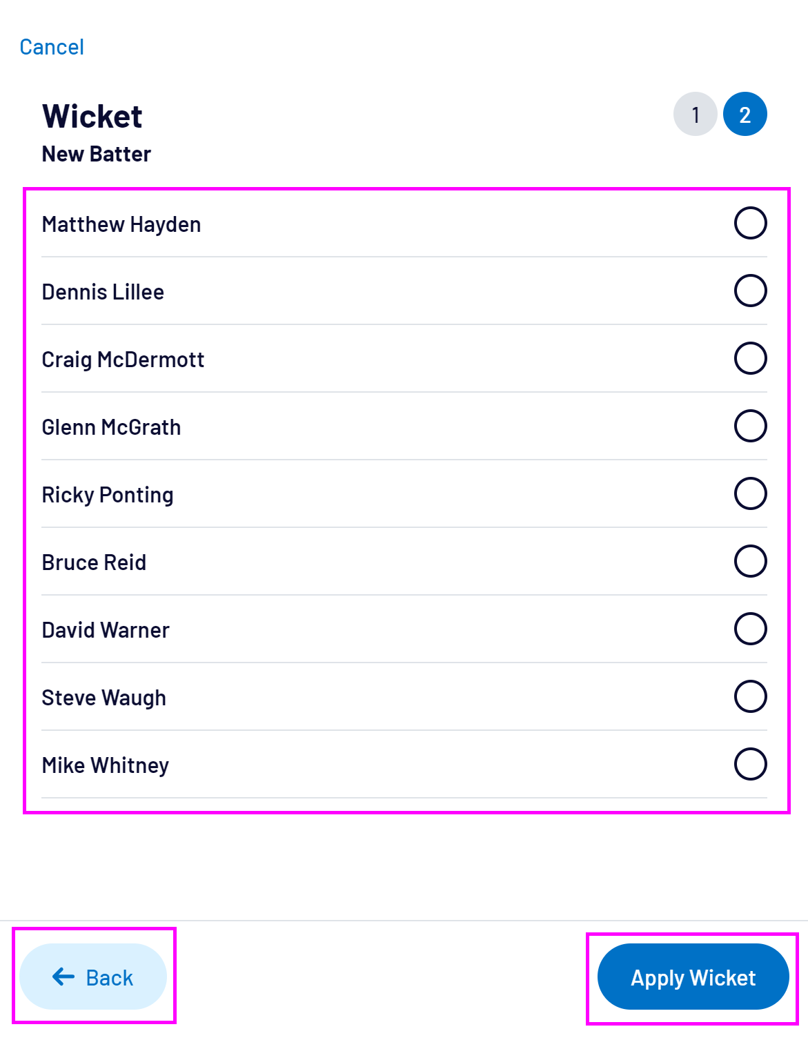 Select the New Batter then Apply Wicket to apply the wicket, or select Back to change the wicket and extra details.