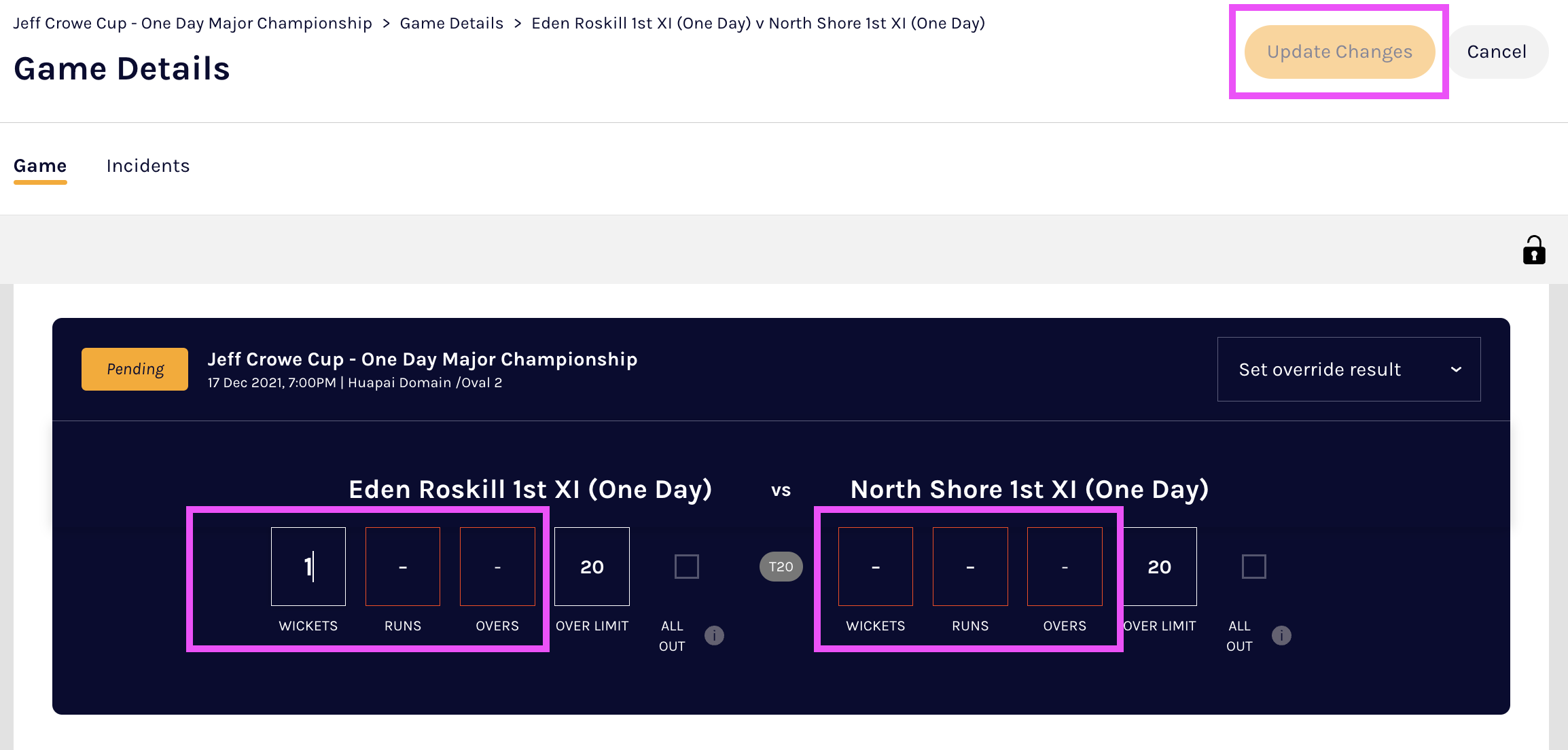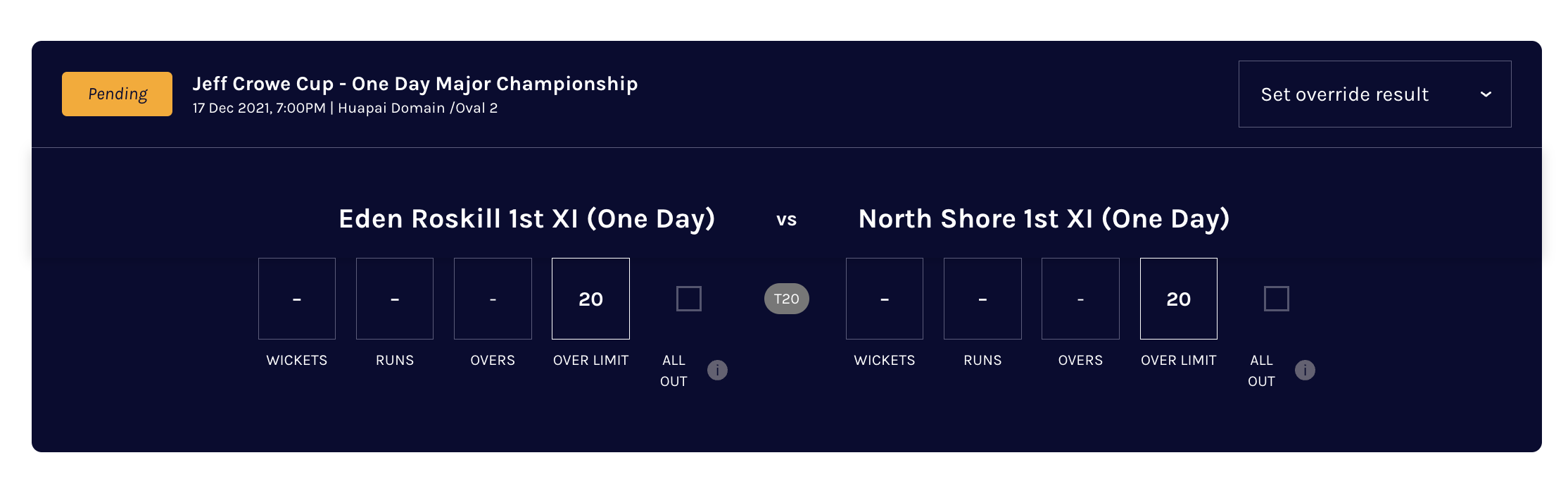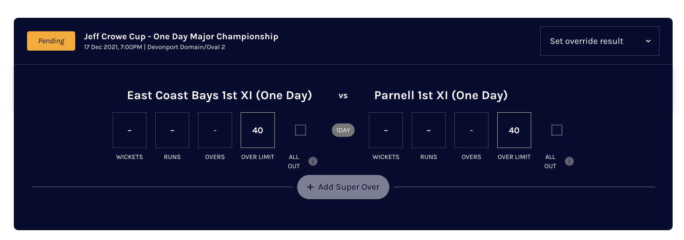 The outcomes are automatically determined by the system based on scores however, if the game has resulted in a a DLS outcome or a revised outcome scenario, the ‘Override Result’ functionality can be triggered to select a manual outcome (Link to DLS article)