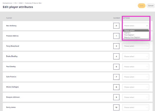 Association and club admins can select captains, vice-captains and deputy vice-captains (options dependant on sports) via the team page.