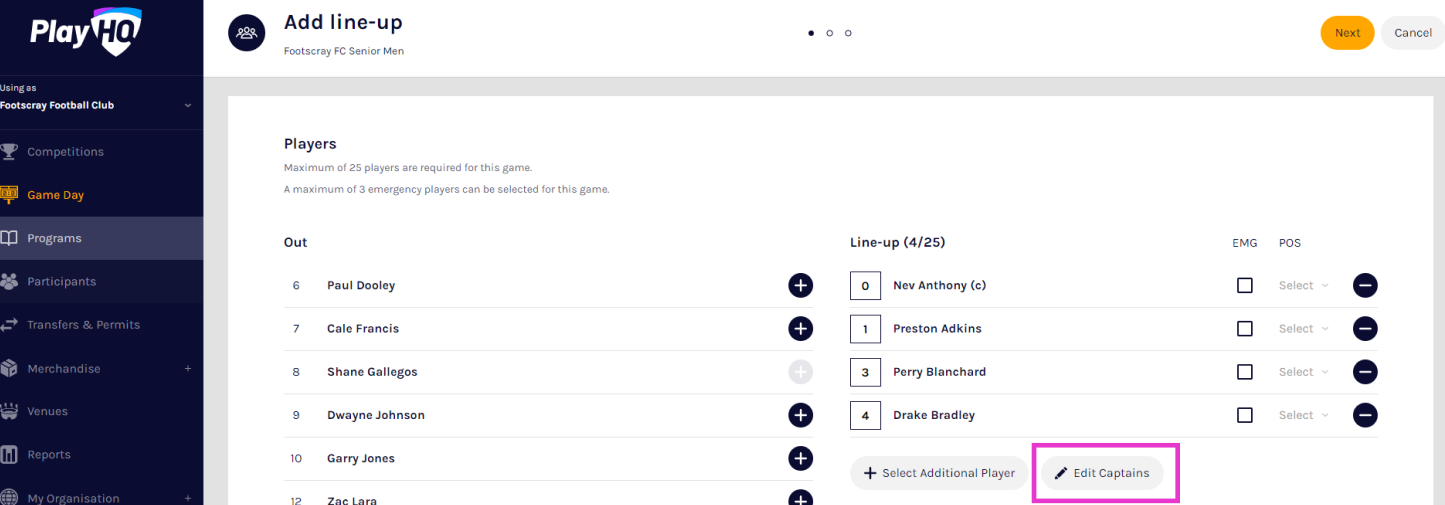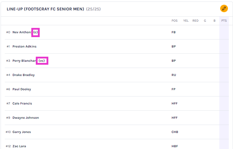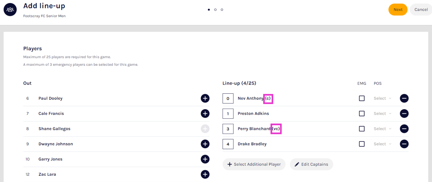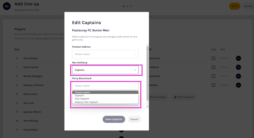 Team captains will be preselected. Captaincy roles can be amended for existing captains or new positions assigned to players added to the lineup. In the example, Nev was selected as a captain on the team page. Perry can also be selected as a captain for this game.