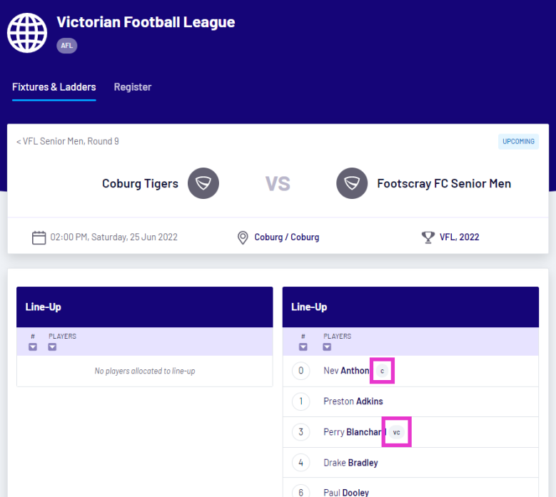 When the lineups are saved, the captaincy tags will display in the game details view.