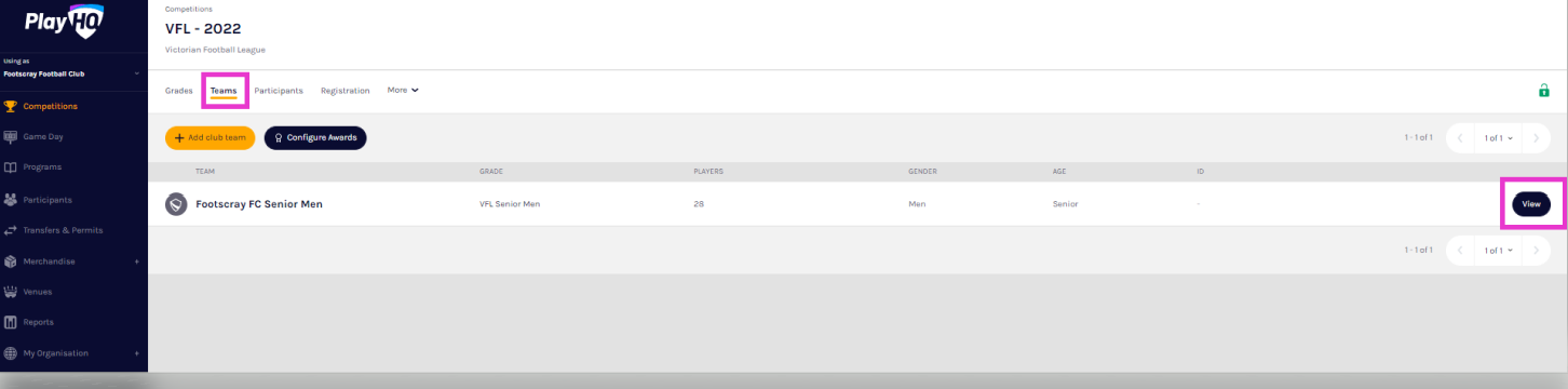Select the Competition Management main menu item, and then the appropriate Competition and Season tile, and then view the Teams tab.