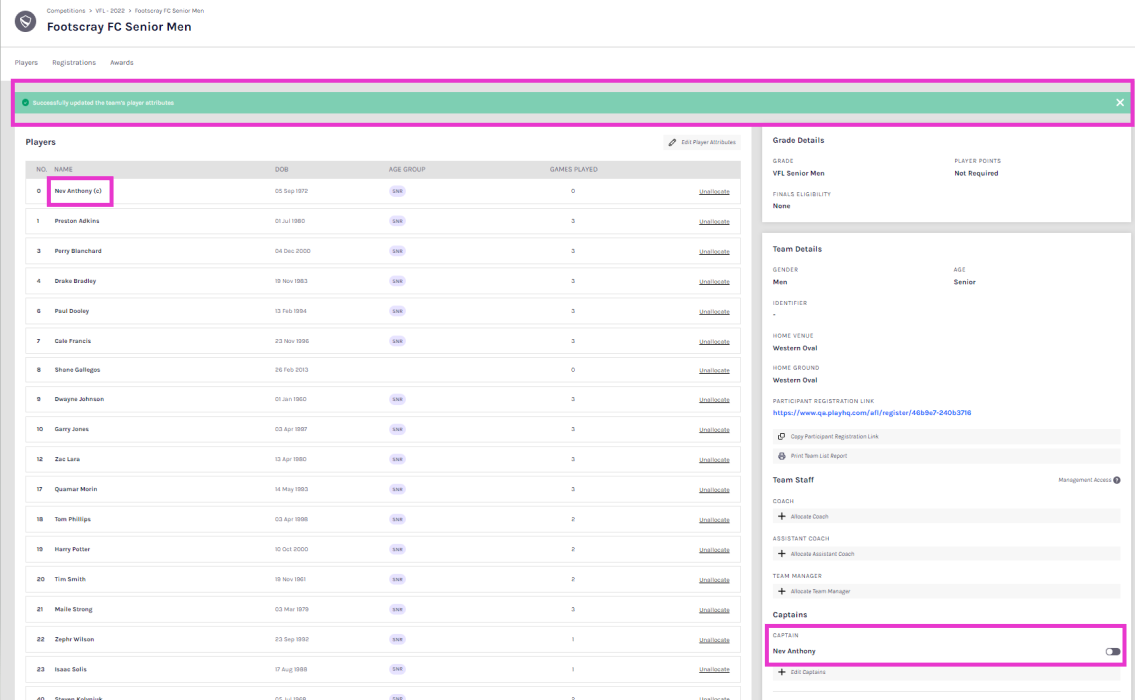 6. Player(s) will appear with the captaincy next to their name, a success message at the top of the screen and they will appear in the Team Staff section with the management access defaulted to off.