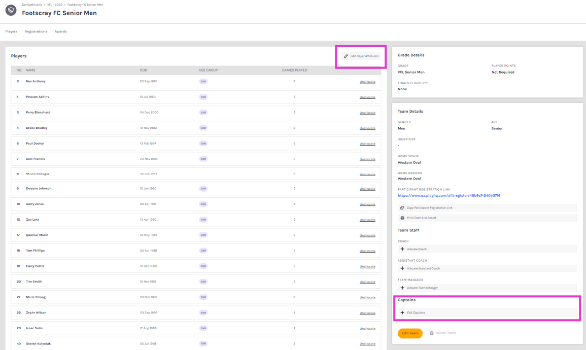 3. Captains can be entered by selecting the Edit Player Attributes in the players section or Edit Captains in the Team Staff section.