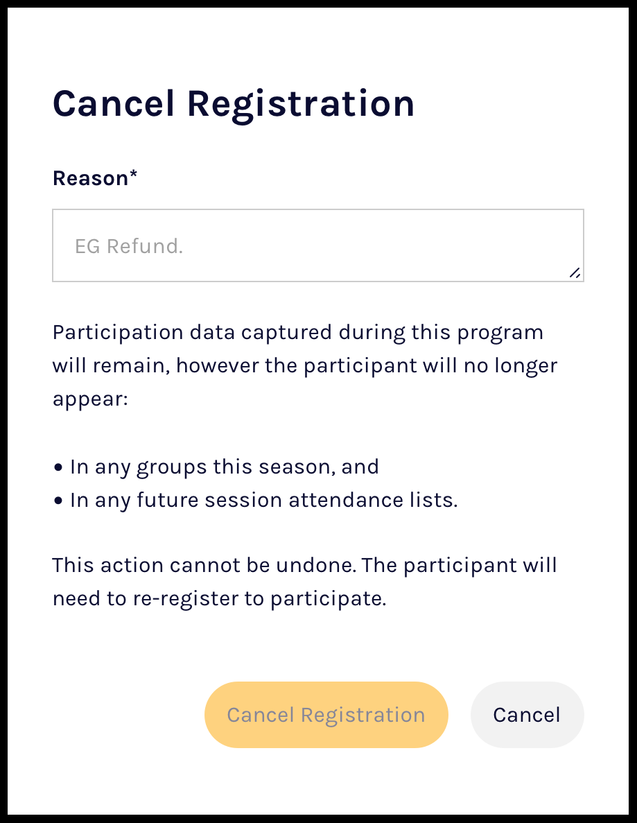 📝 Note: Cancelling a registration does not refund any fees to the participant. In addition, a cancelled registration cannot be reversed and the participant will need to re-register to participate in the season.