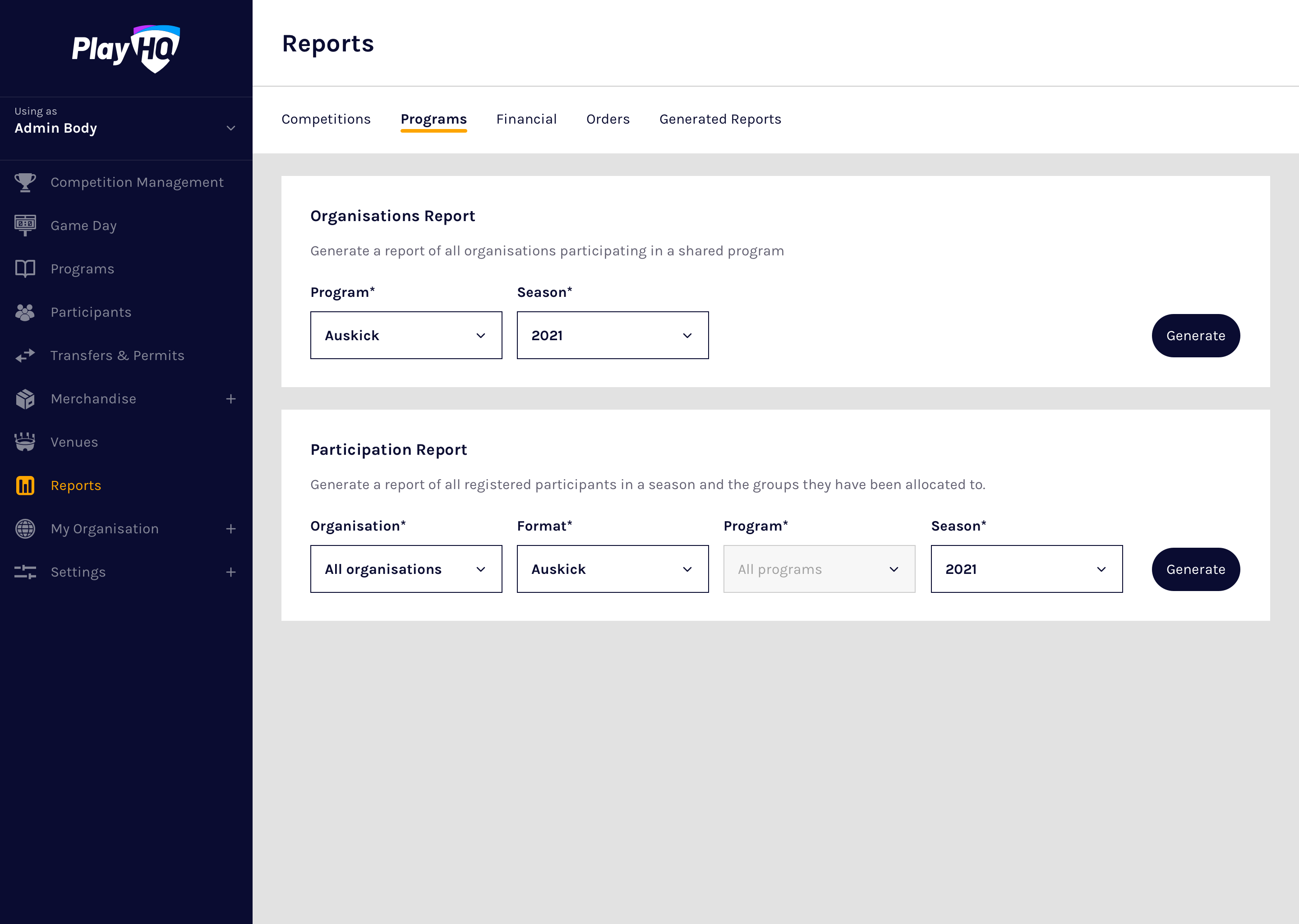 To generate the organisation's report, navigate to Reports, and select the Programs tab. Next, select the relevant Program and Season in the Organisations Report section, and then select Generate: