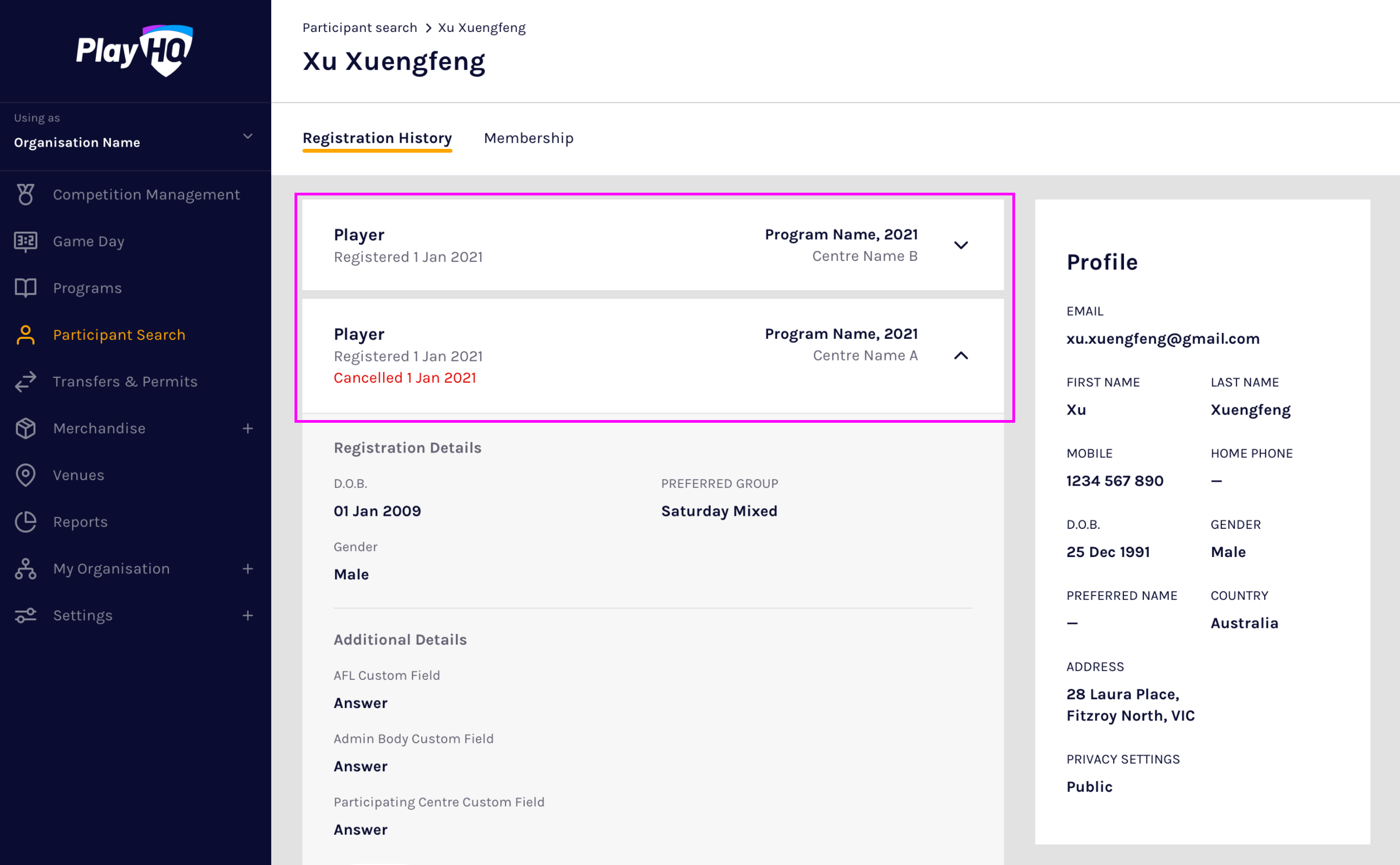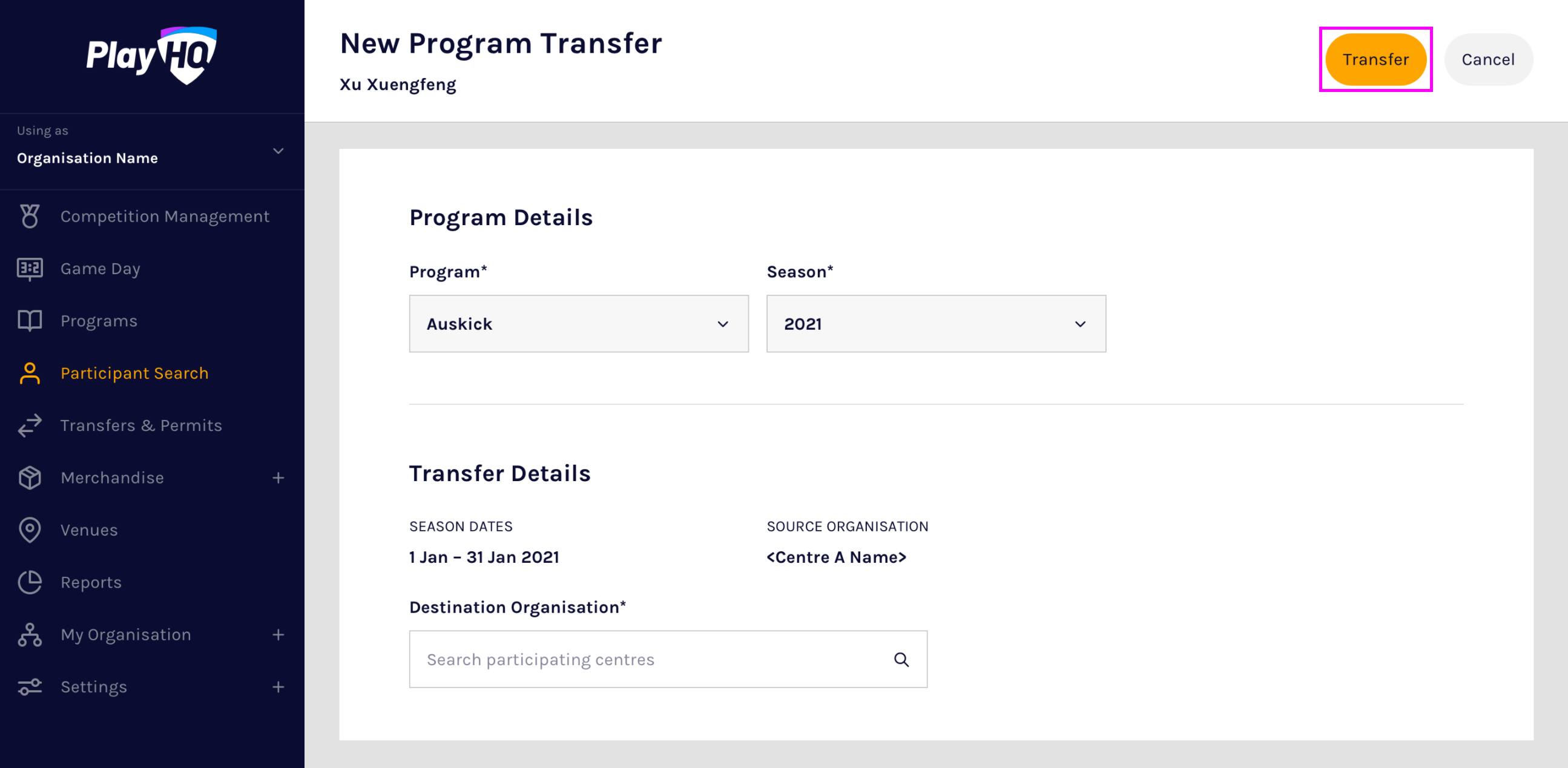 Program transfers allow a participant who has registered to one organisation, to have their registration transferred to a different organisation participating in the same program season. When a participant's registration is transferred, their existing registration is cancelled in the source organisation and a new registration is created in the destination organisation.