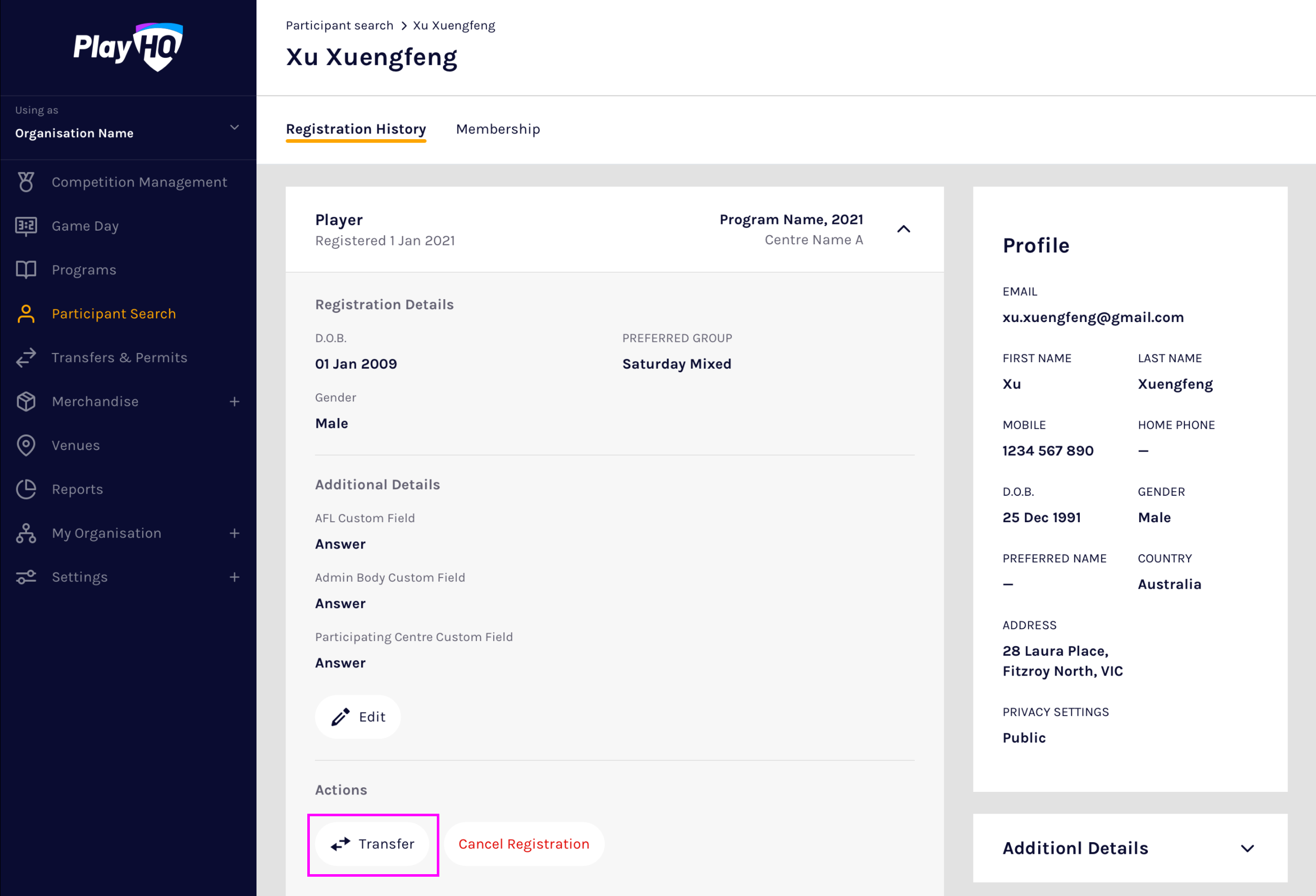 To transfer a participant between organisations, search for the participant to transfer and navigate to their participant profile. On the profile page, expand the appropriate registration record to be transferred then select Transfer: