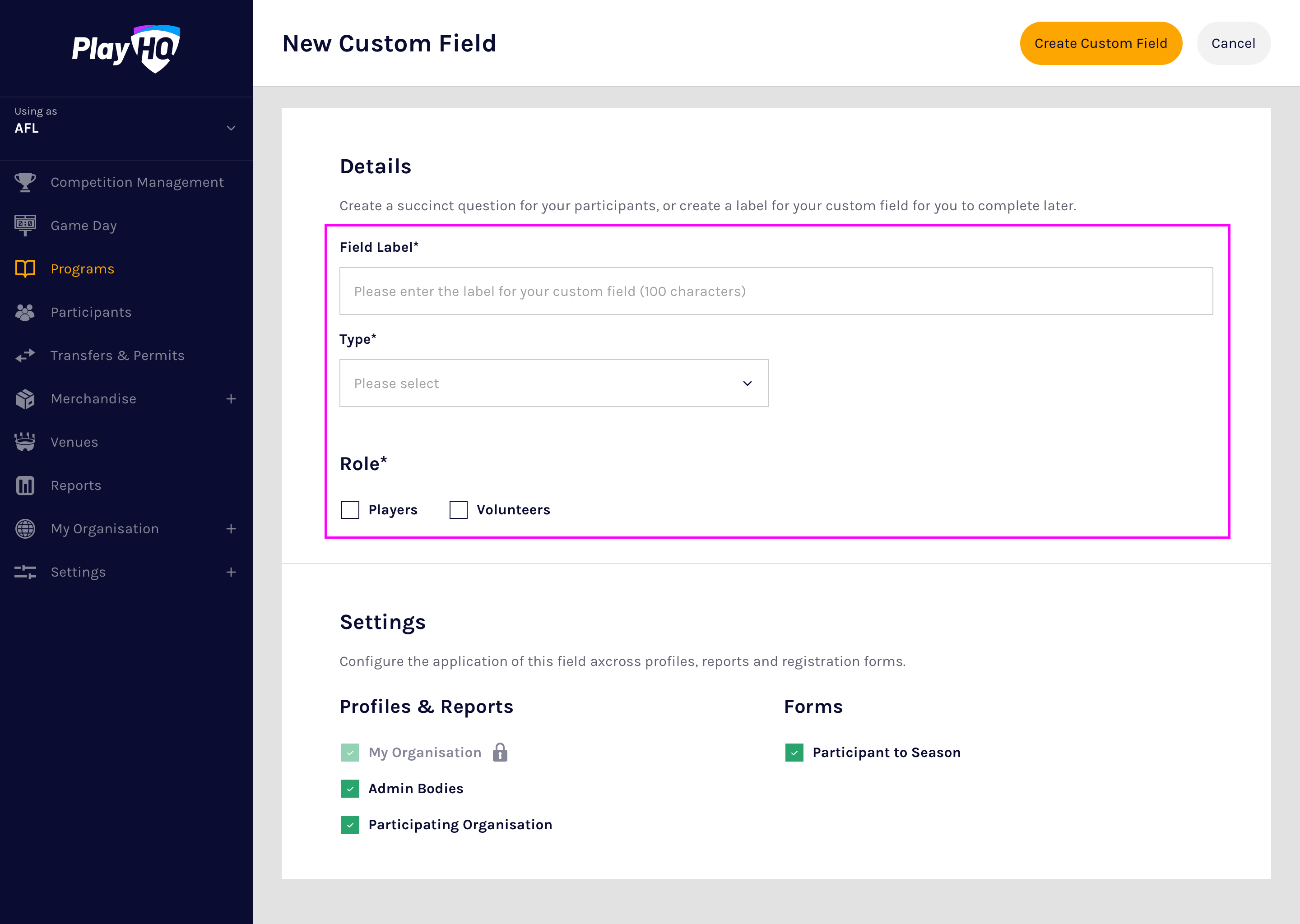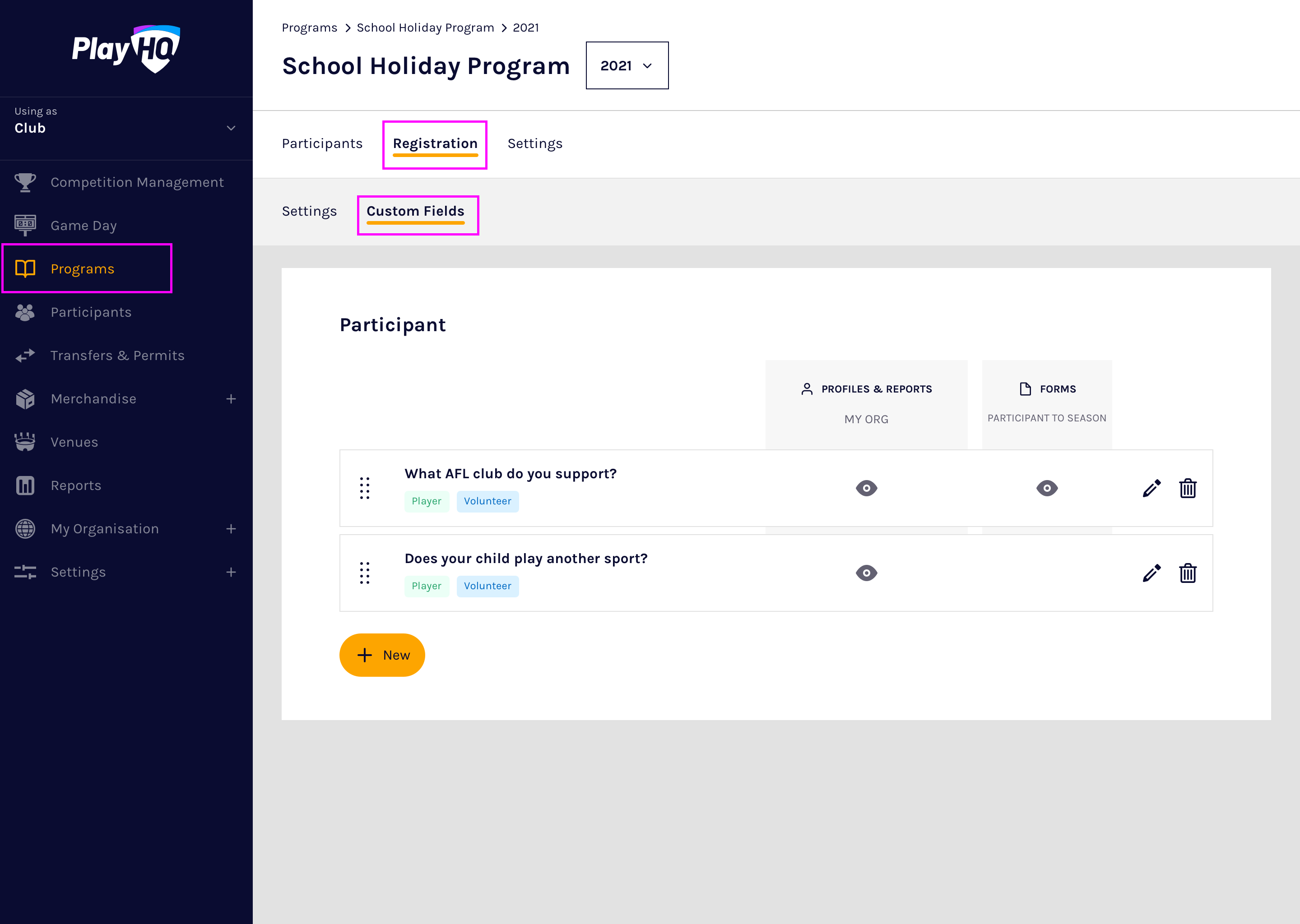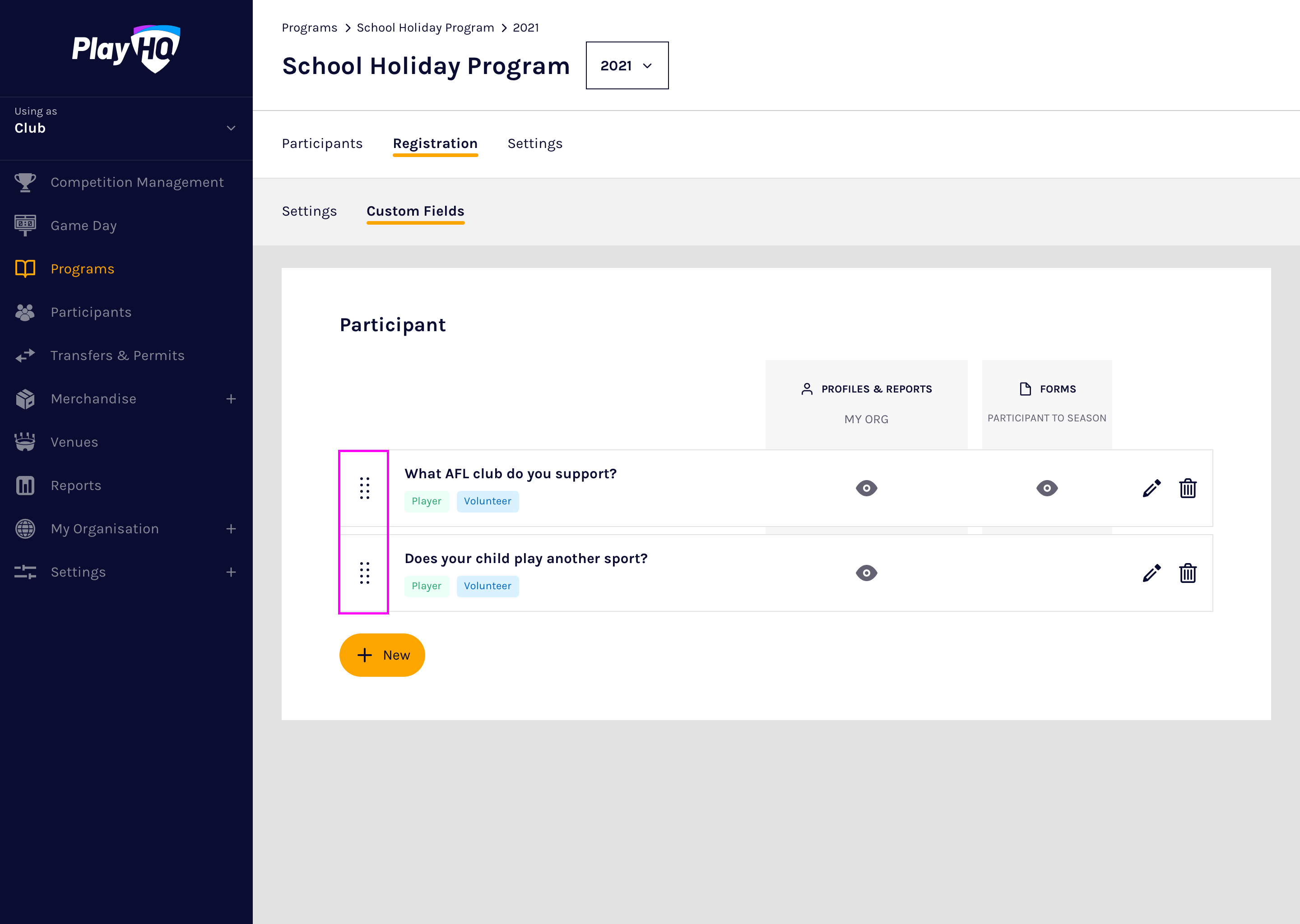 Custom fields are configured on a season by season basis and PlayHQ currently supports text box and dropdown list custom field types.