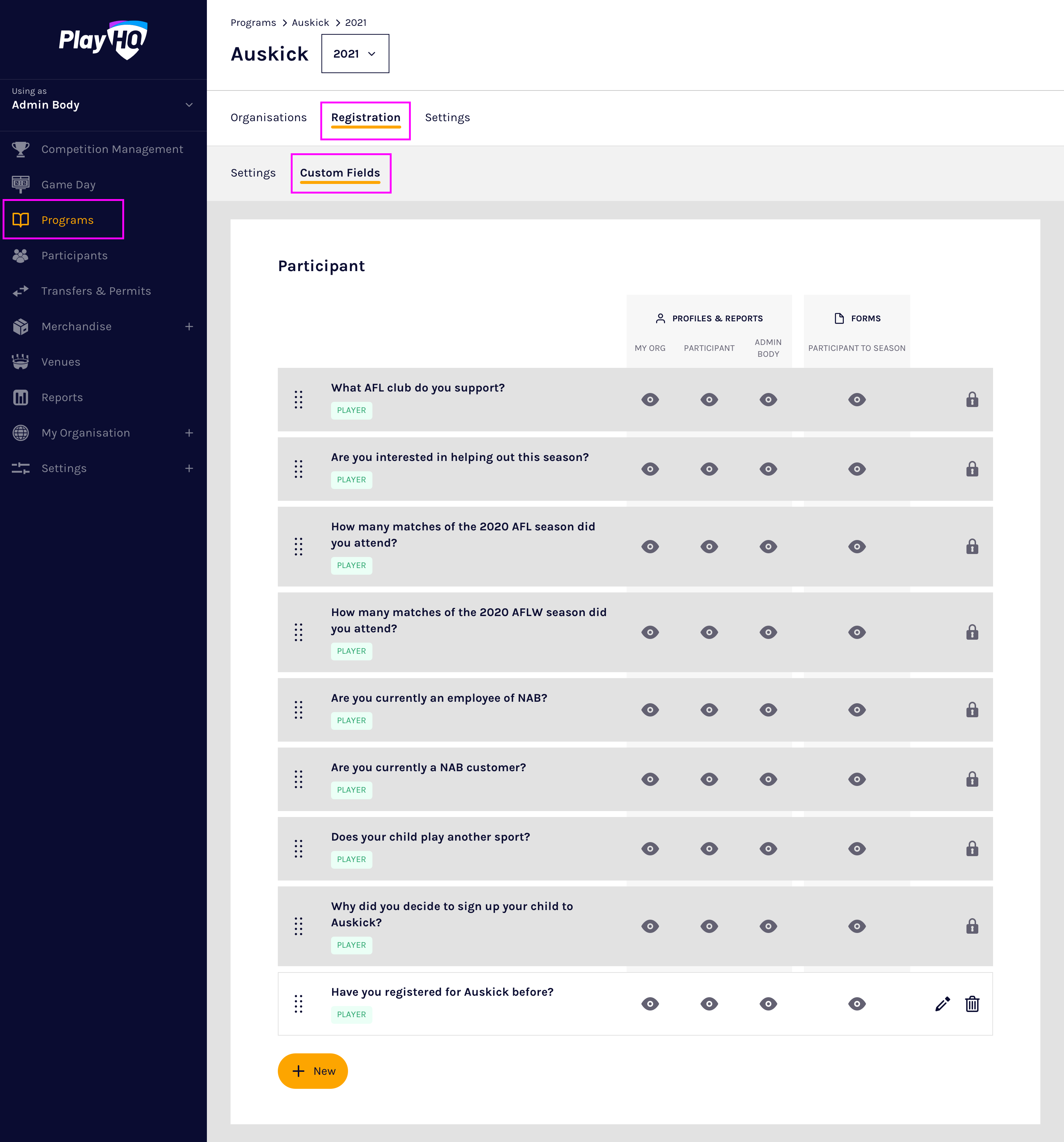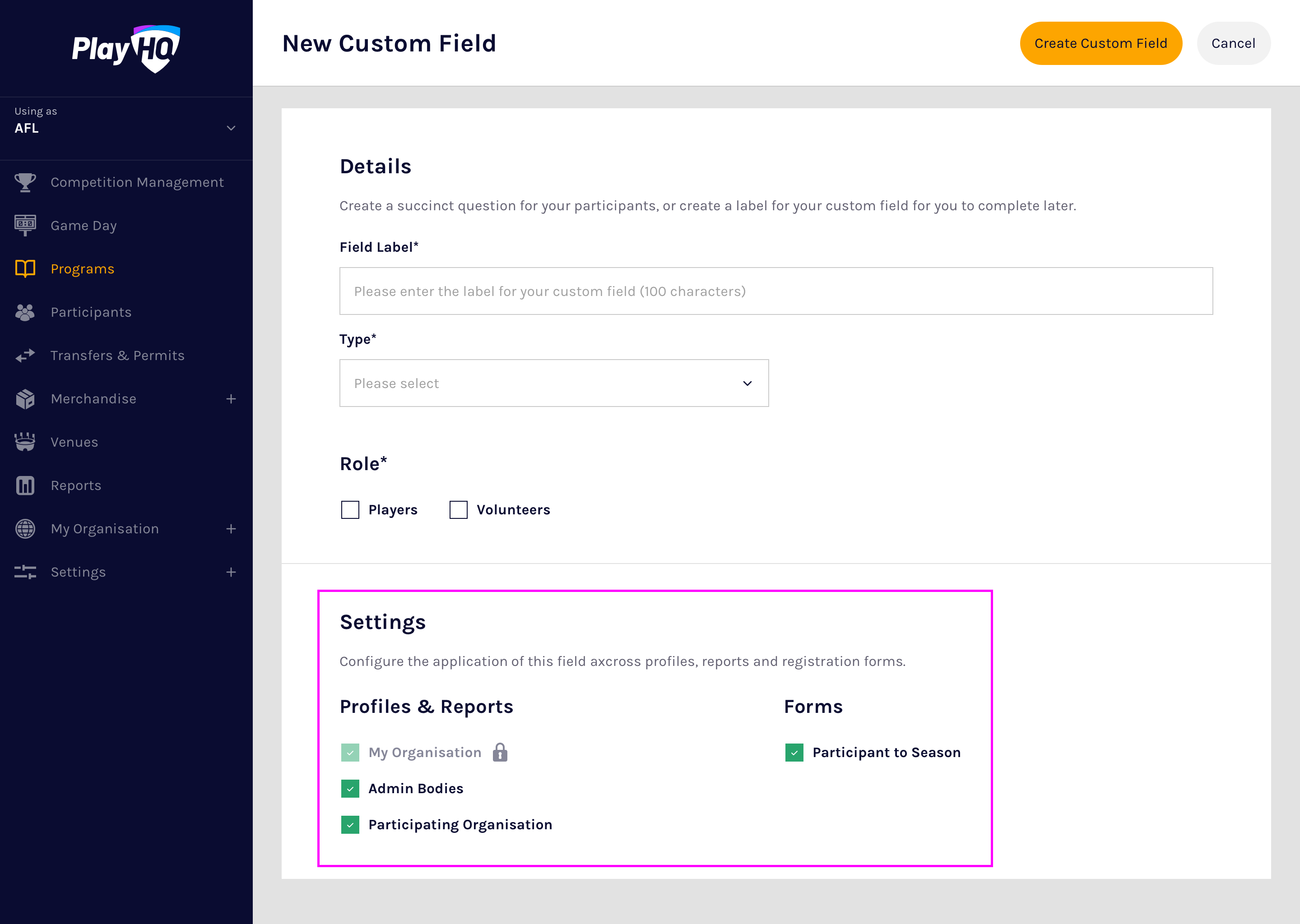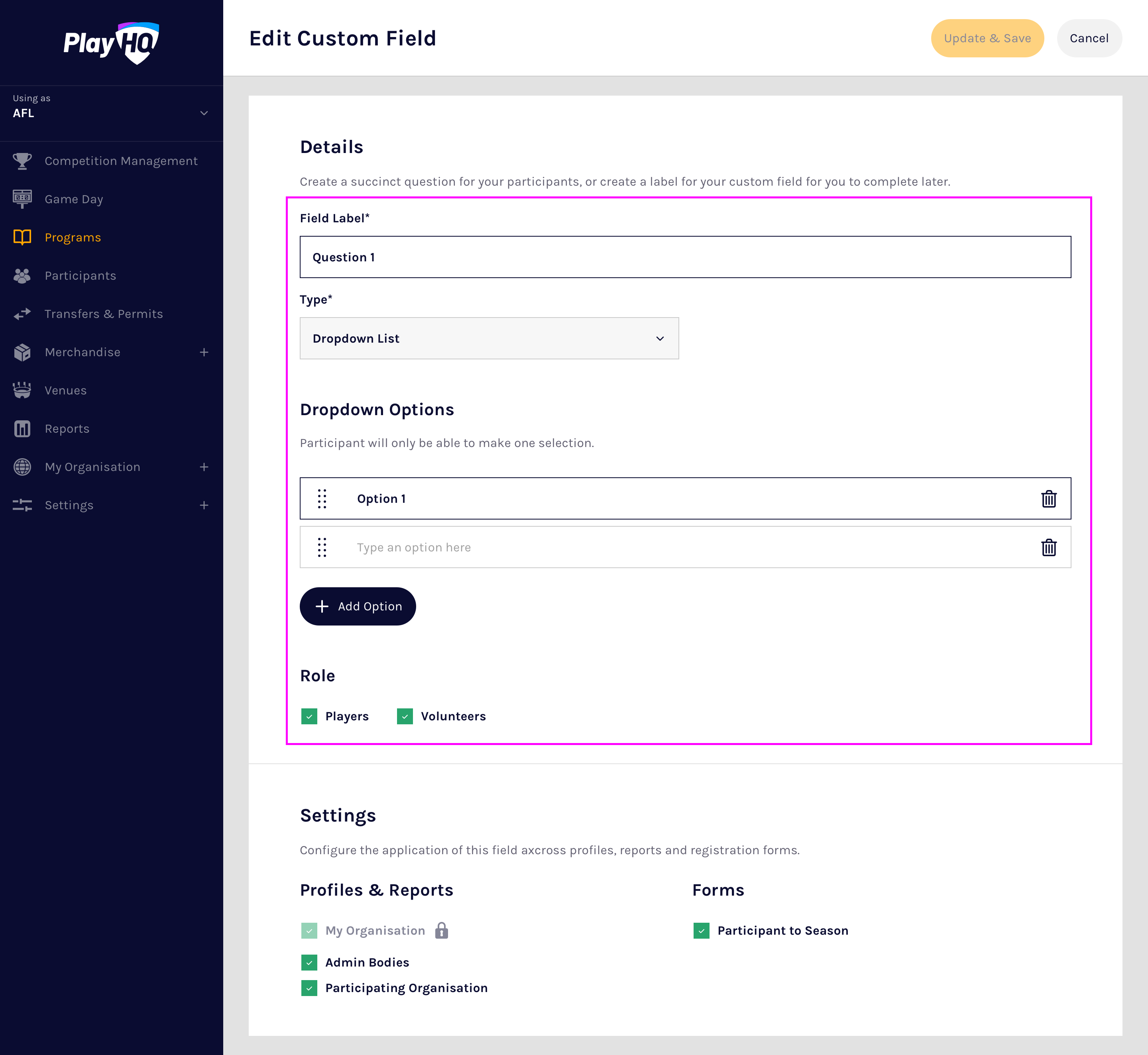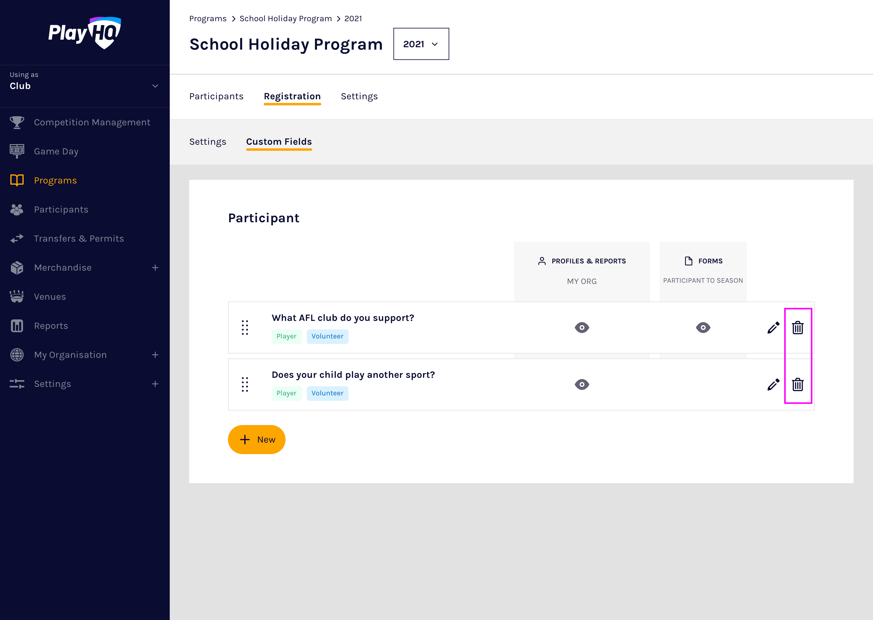 Custom fields are configured on a season by season basis and PlayHQ currently supports text box and dropdown list custom field types.