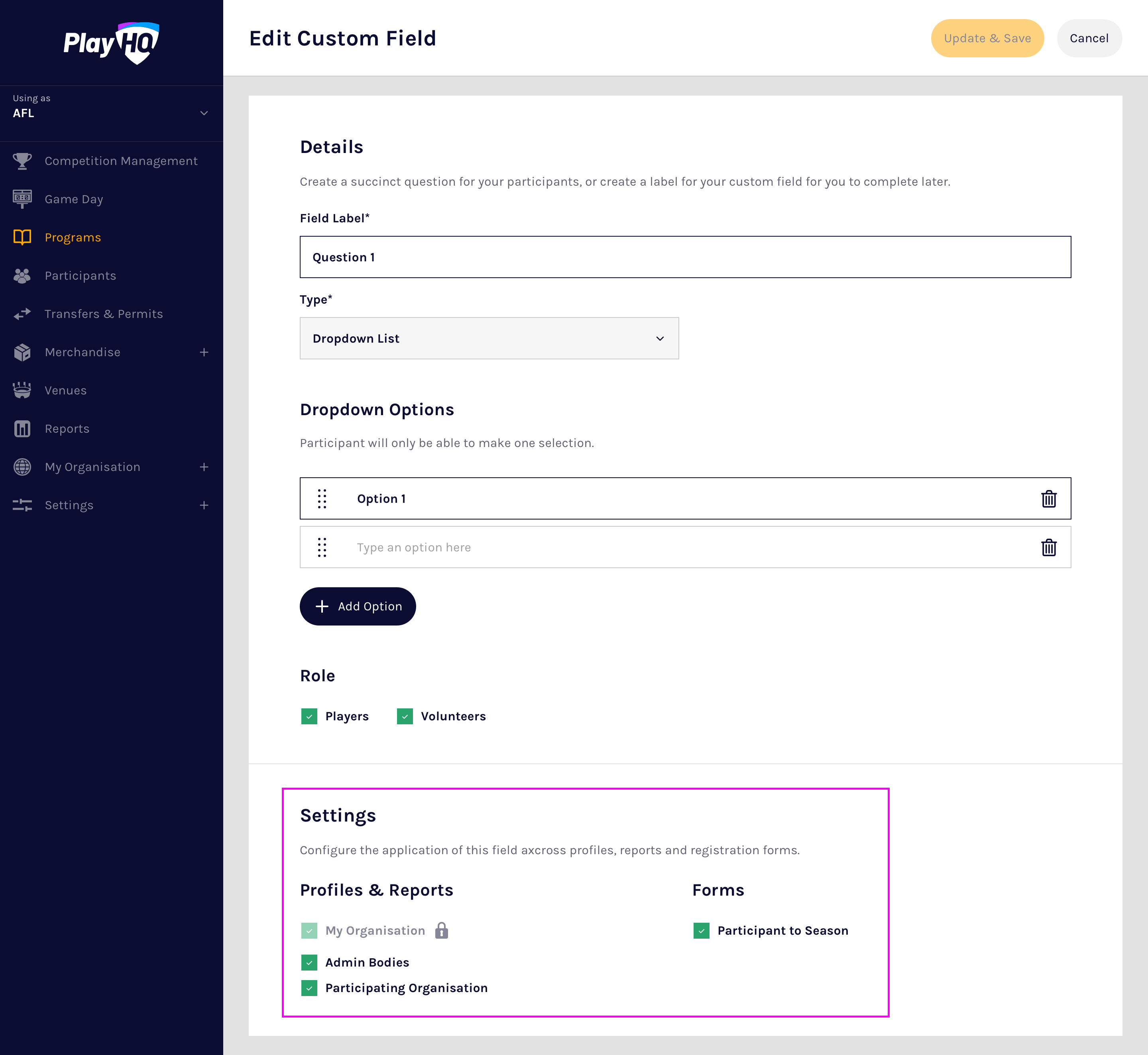 This article describes how custom fields can be created, updated, and deleted for a program season.