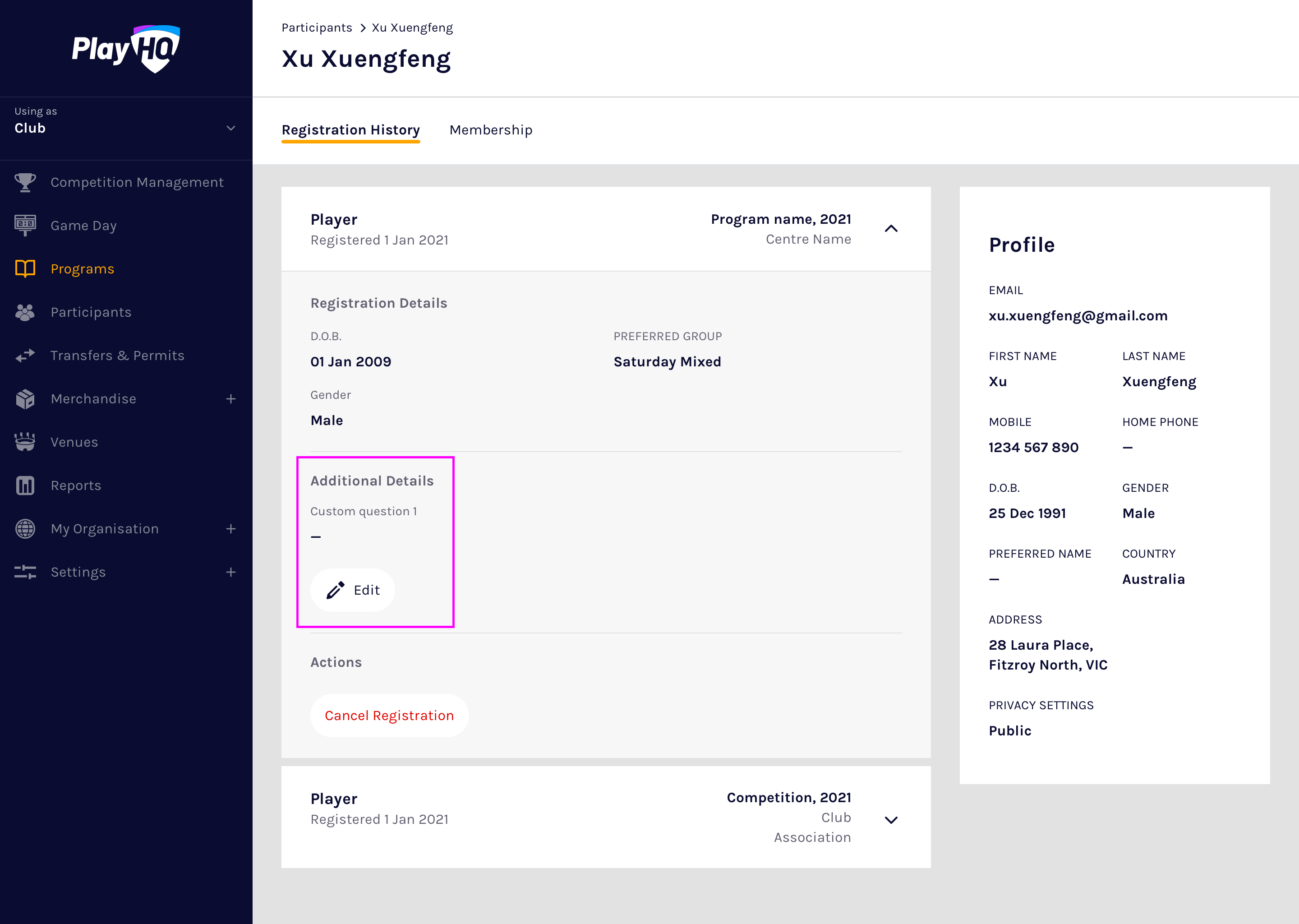 Custom fields allow additional information to be captured from participants during registration, or for additional information to be captured against participants by administrators after registration.