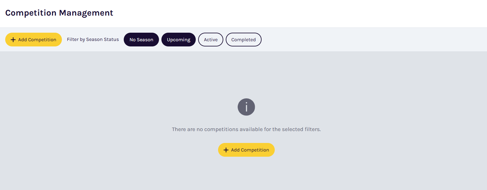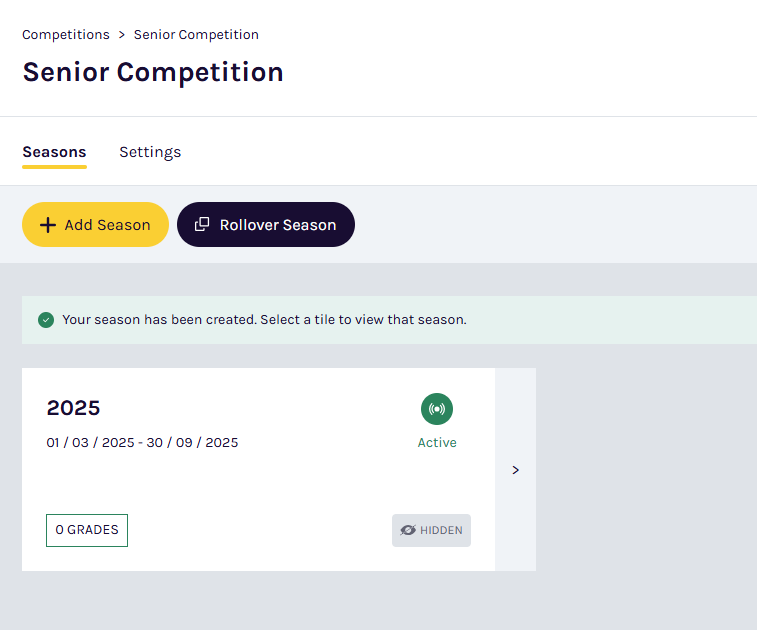 Select your newly created competition, then click the + Add Season button. Fill in the season details, including name, start and end dates.