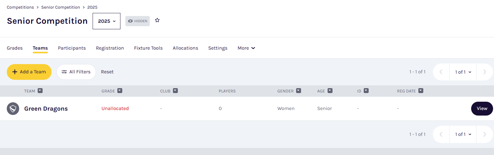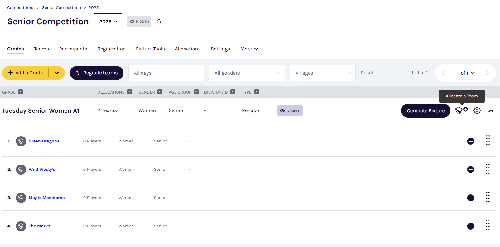 Find the grade you want to add teams to. Click the Allocate a Team icon next to the grade name to select from the available teams in your season.