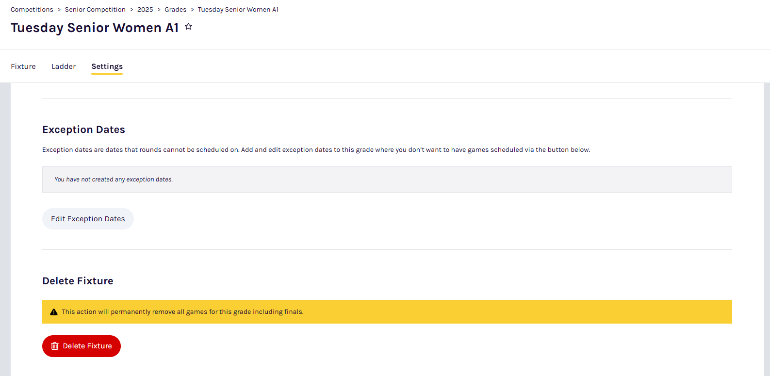 Navigate to the grade's Fixturing settings. Click Edit Exception Dates then enter dates when games should not be scheduled. You can preview the changes to the fixture which will occur when setting your exception dates.