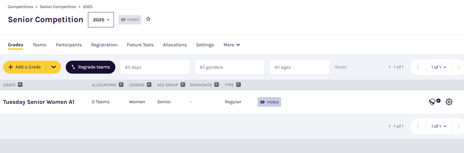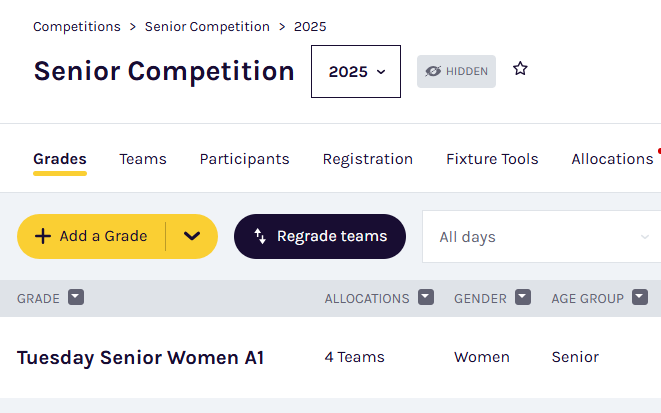 During the season, you may need to move teams between grades to ensure competitive balance. The regrading process allows you to: