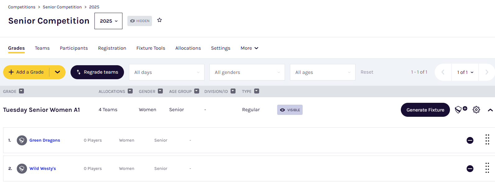 Ensure you have at least two teams assigned to a grade. Click Generate Fixture for the grade. Configure the fixture options (rounds, times, venues) before clicking Generate to preview then create the grade fixture.
