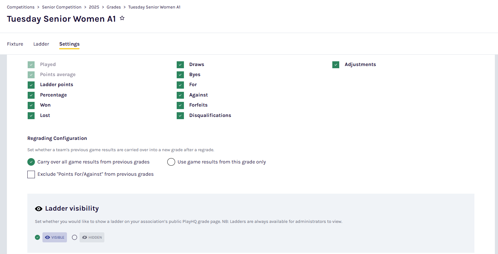 Select your ladder type and set ladder visibility options. Configure points for win, loss, draw, etc.