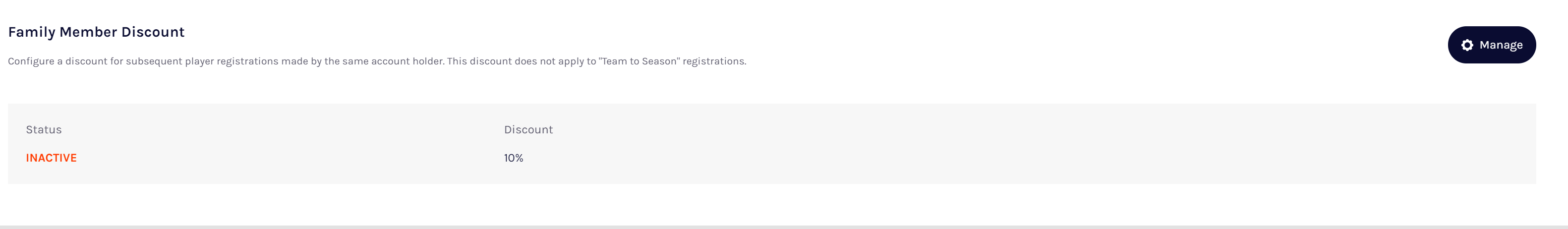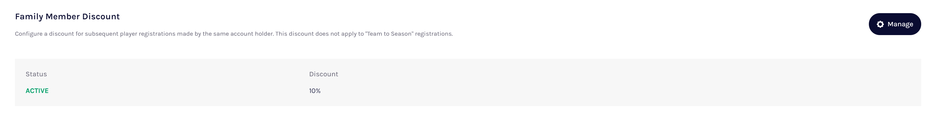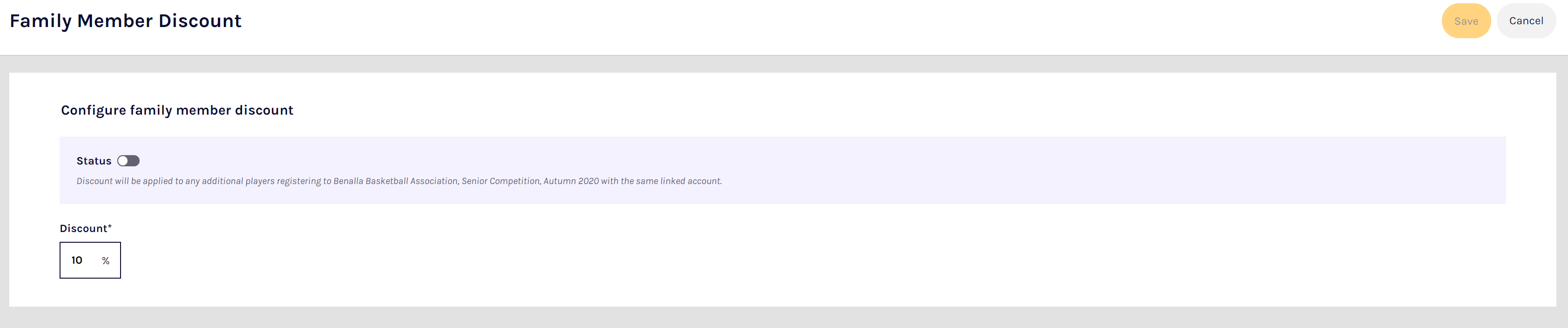 The Family member discount feature provides a percentage discount off the applicable organisation (Association or Club) player registration fee which applies to each subsequent player registration registered under the same account holder, to the same organisation, and within the same competition and season. The family member discount does not apply to registrations to any Program.