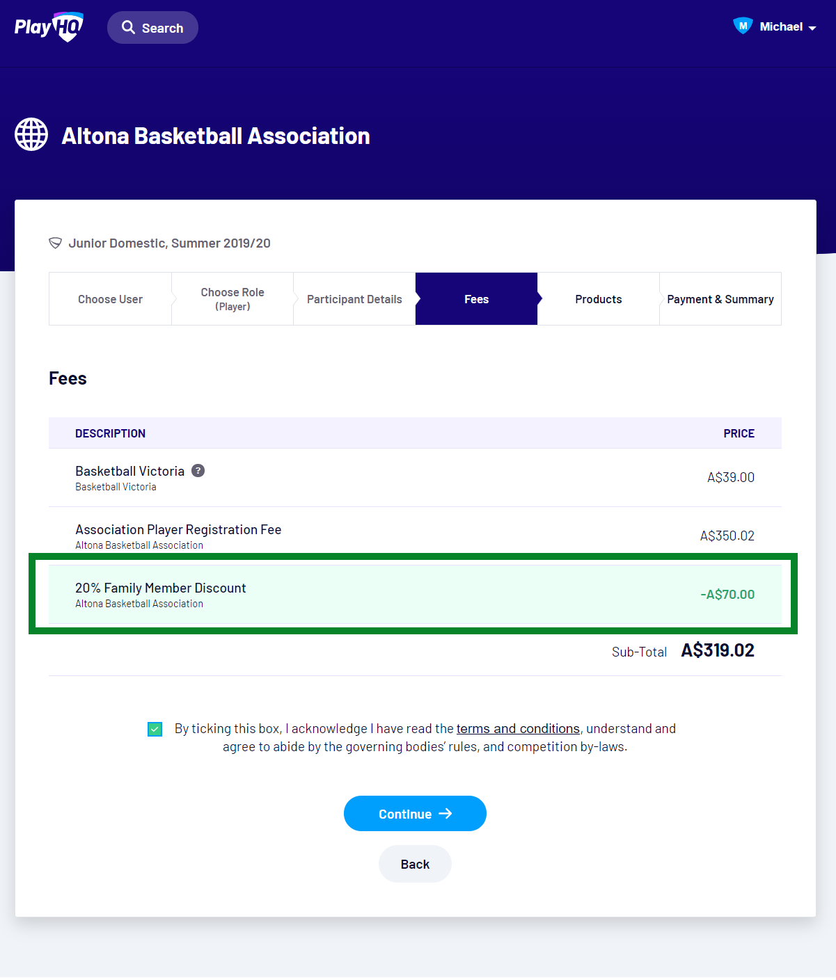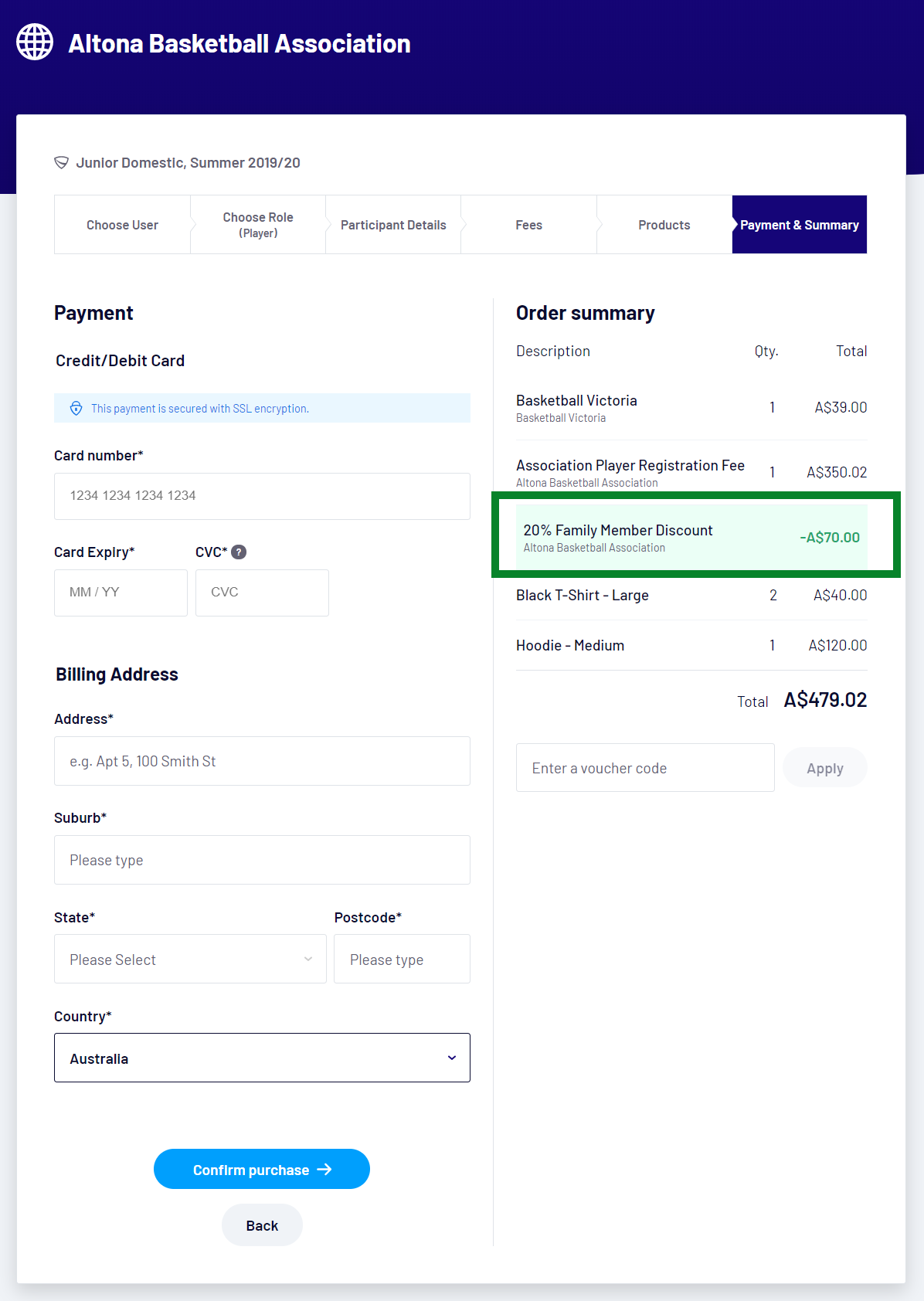 Players only receive the family member discount from the organisation they are registering to. For example, a discount won't be applied to association fees as well as club fees when using a club participant registration form.