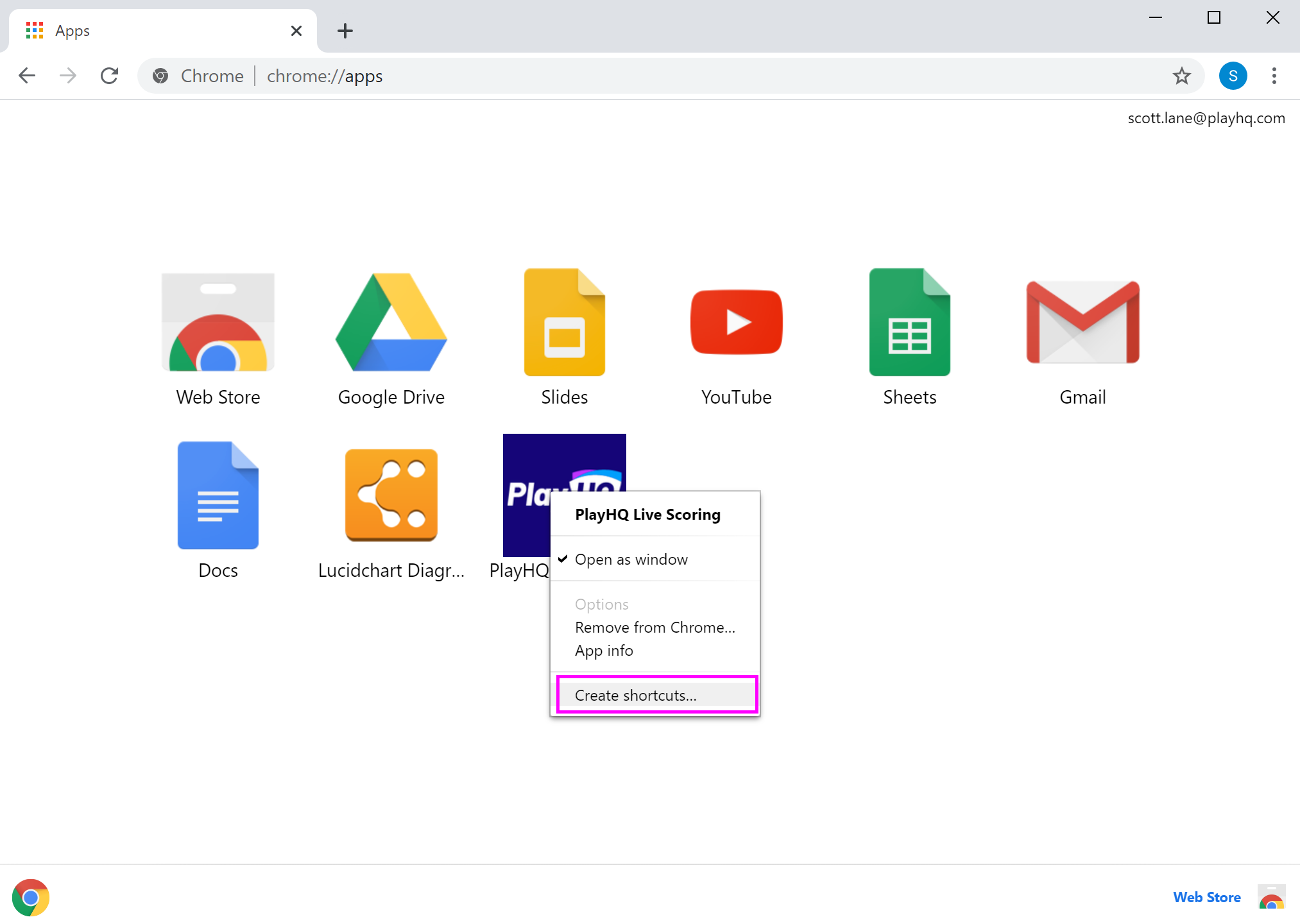 Right-click on the 'PlayHQ Live Scoring app' and select the 'Create shortcuts...' option: