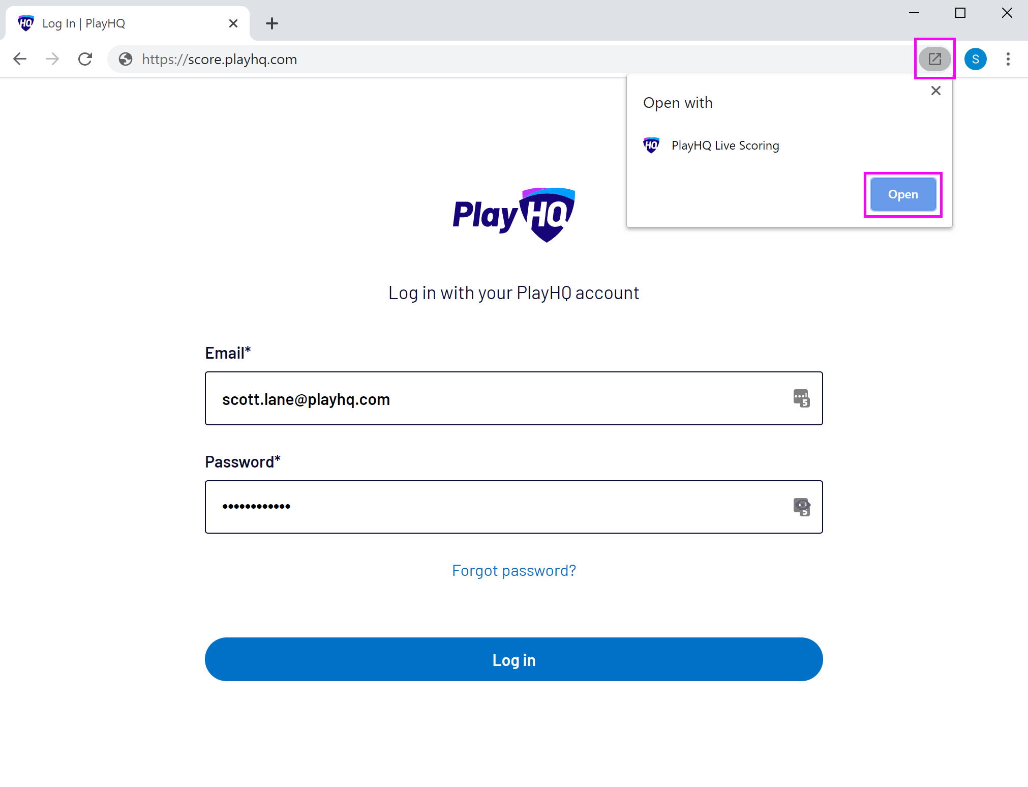 Select the 'Customise and control Google Chrome' icon in the top right corner of the browser, then select 'Open in PlayHQ Live Scoring:
