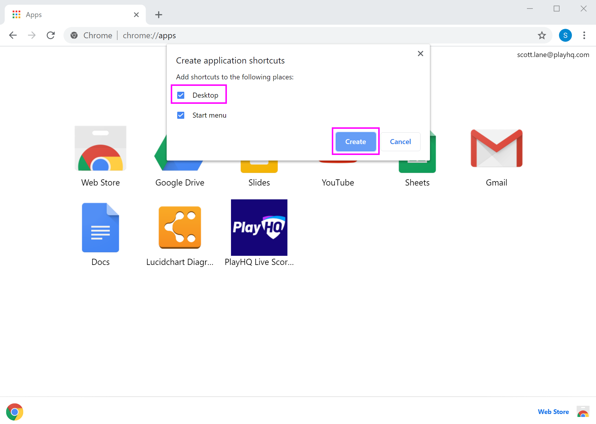 If the desktop shortcut was not created, navigate to chrome://apps in Google Chrome: