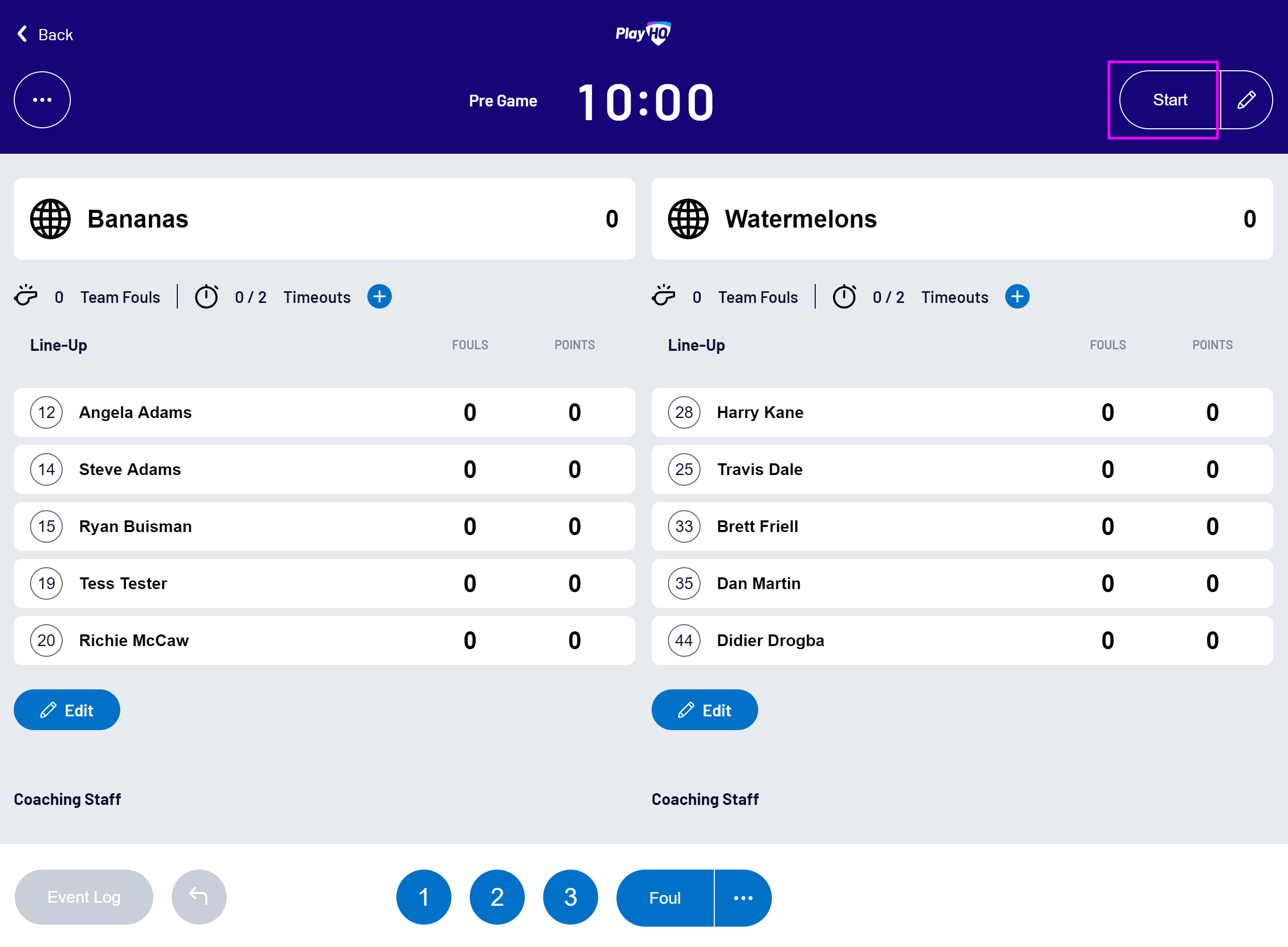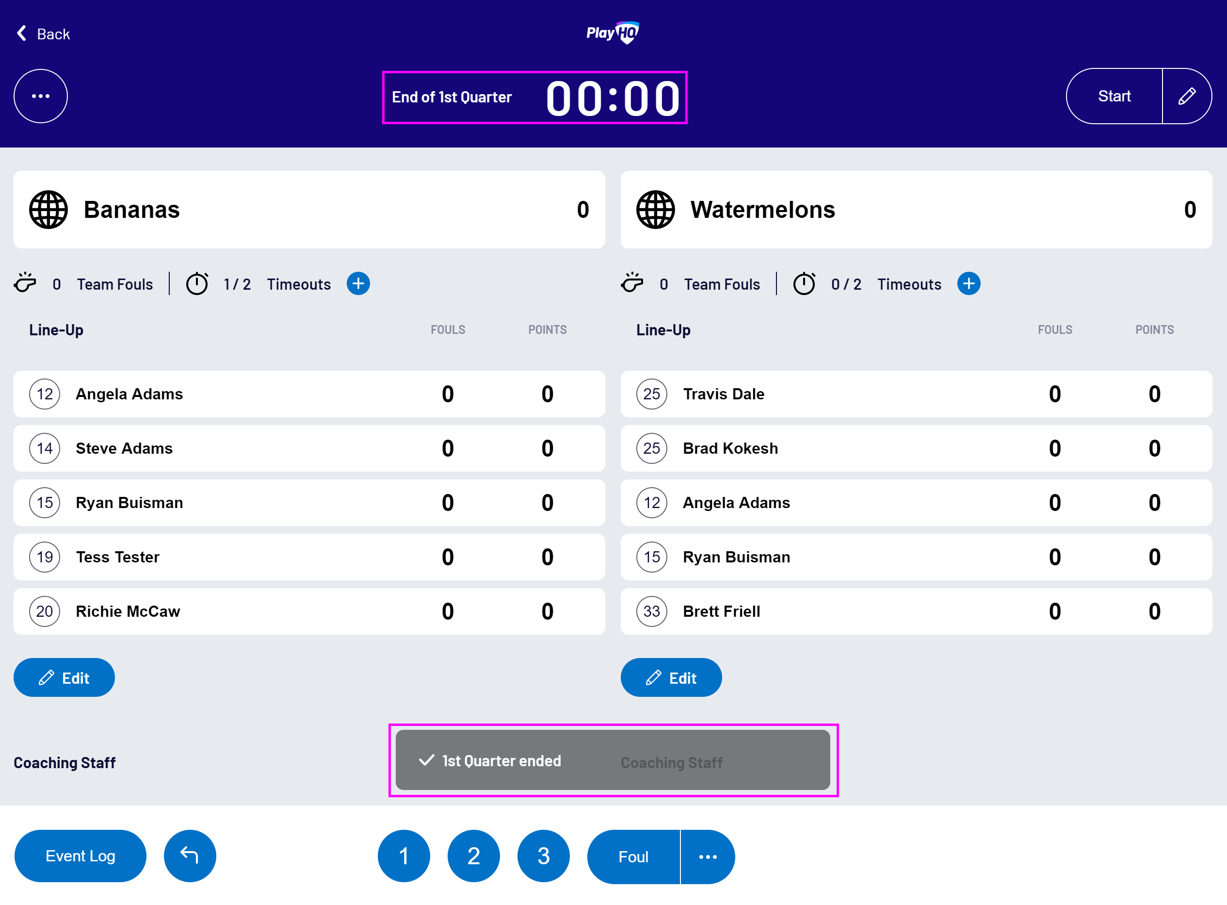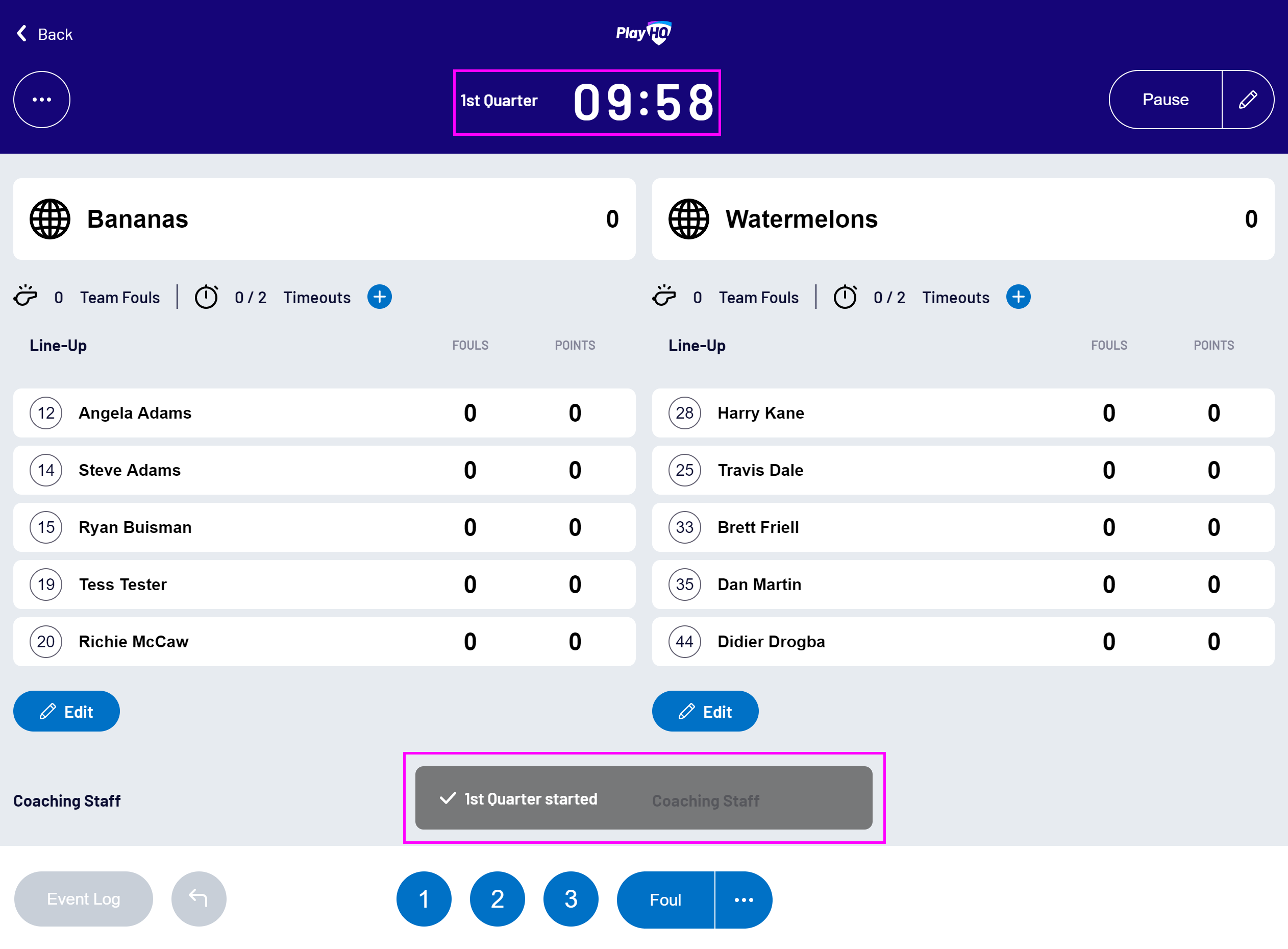 The current period will be updated, the game clock will start counting down, and a confirmation message will be displayed: