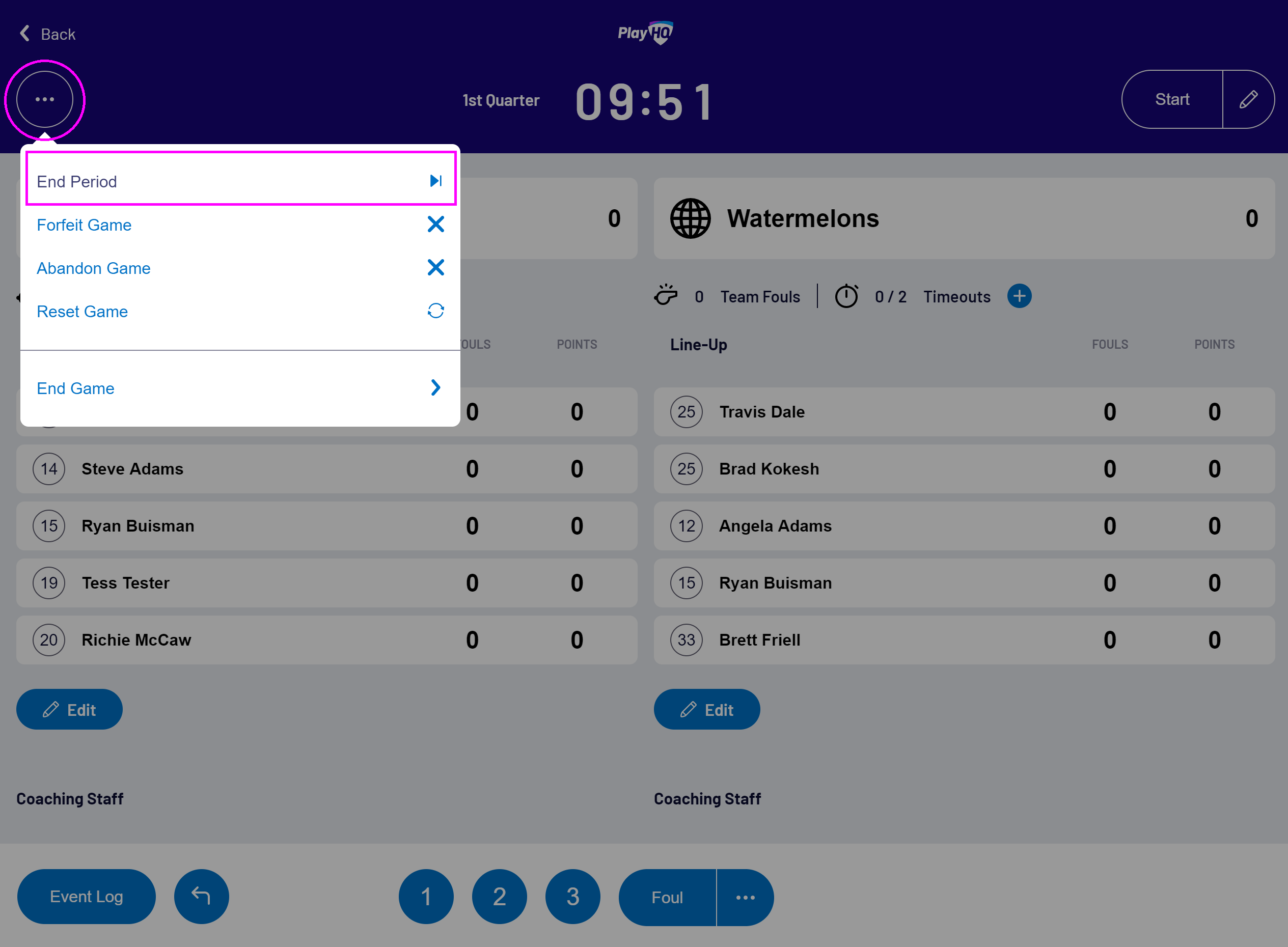 To manually end a period, select the ellipses menu (...) in the top left corner, then select End Period: