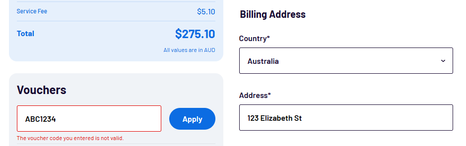 Voucher codes let you apply discounts to registration fees when provided by your organisation. These codes can offer either a fixed dollar amount or percentage discount off your registration fees.