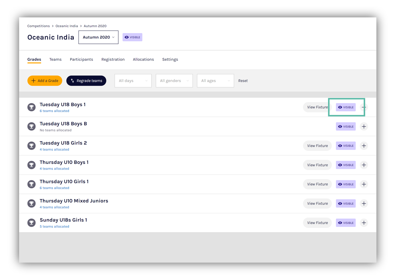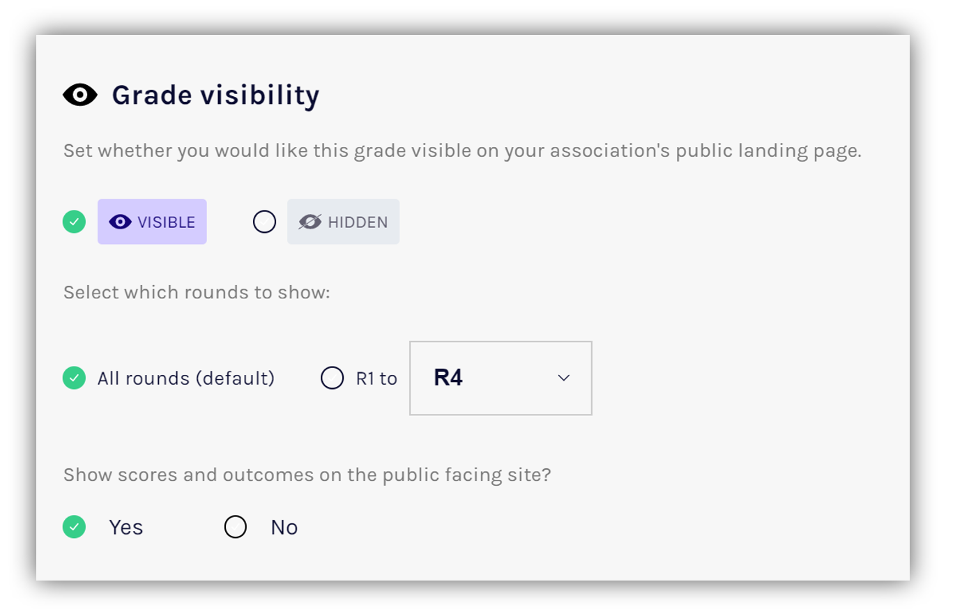 Managing a grade's public visibility setting controls whether or not the public can view the grade on the organisation's public-facing PlayHQ Discover page.