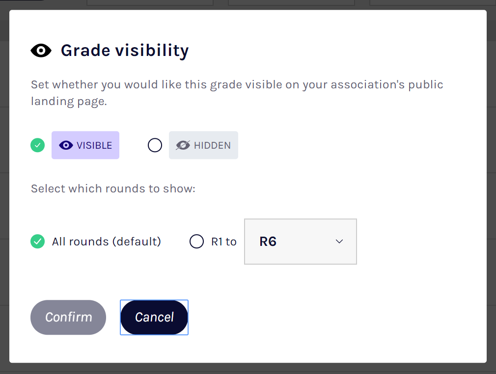 You can also click directly on the visibility status of a grade to reset the grade visibility and rounds to show via a pop-up modal that will appear.