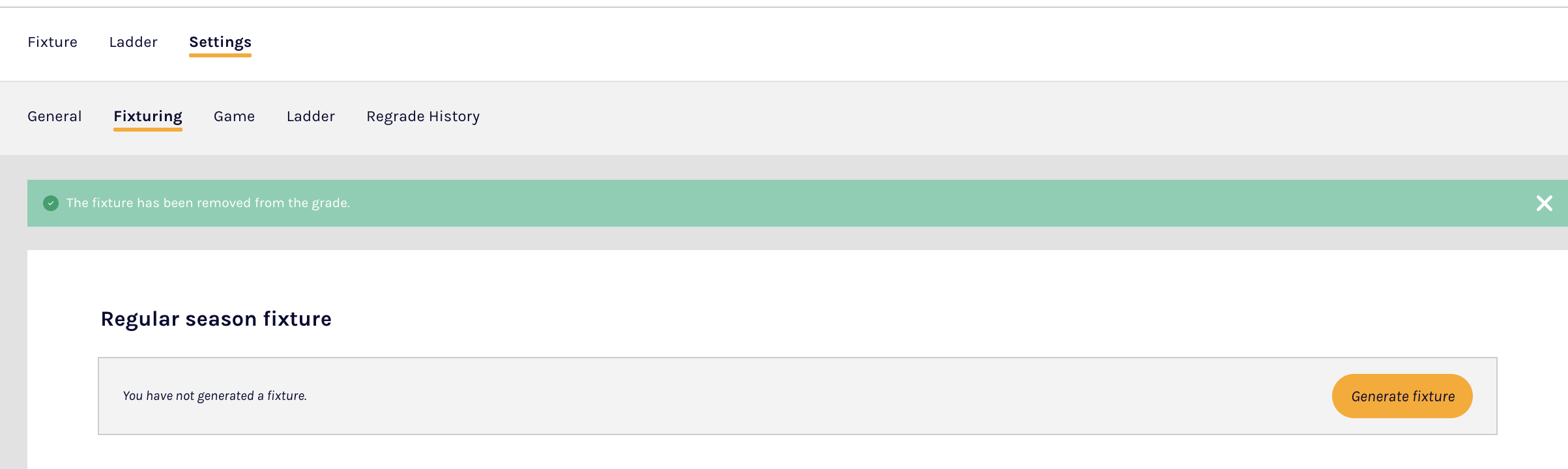 A 'Generate Fixture' button will appear on the Fixturing settings page so that you can easily and quickly generate the grade's \ fixture again, using the same process described in generating a fixture for your grade.
