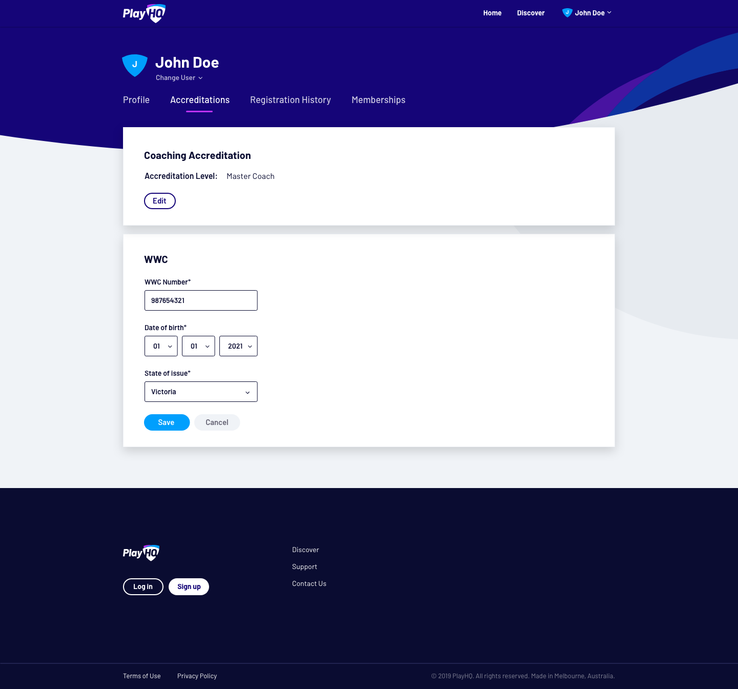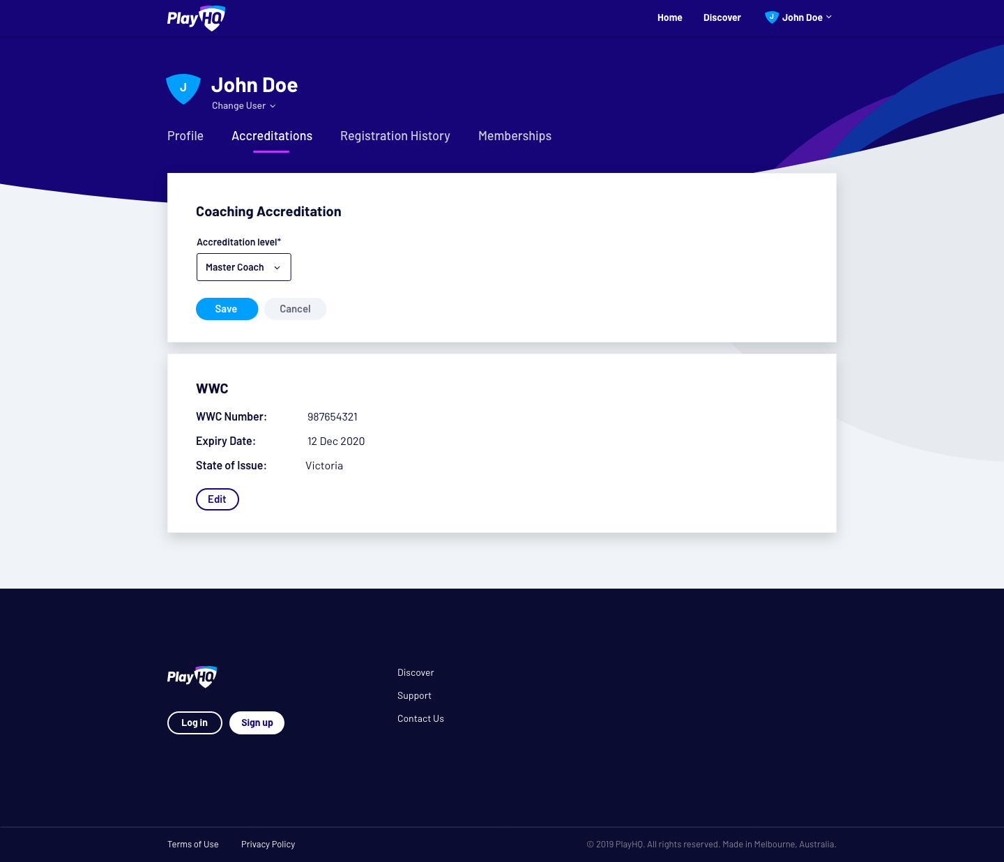 The Coaching Accreditation section, if available, can be updated by selecting the Edit button. This will result in the Accreditation level field being editable.