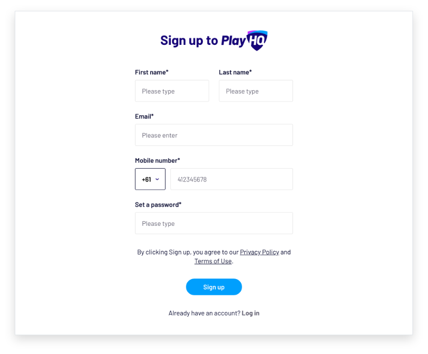 Enter your First name, Last name, Email, Mobile number, and set a password. View the PlayHQ Privacy Policy and Terms of Use by clicking on the provided links. You will be accepting both the Privacy Policy and Terms of Use if you complete the sign up process.