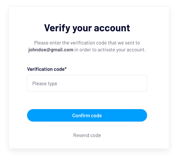 After you have submitted the sign up form, you will be taken to the Verify your account page. A verification code will have been emailed to the email address you created your account with. Enter this verification code and click the Confirm code button.