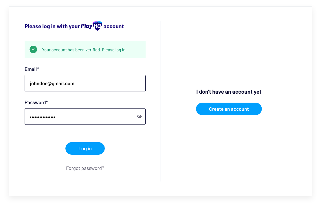 Once you have verified your PlayHQ account, you will be taken to the login page. Enter your email address and the password you set earlier, and click the Log in button.